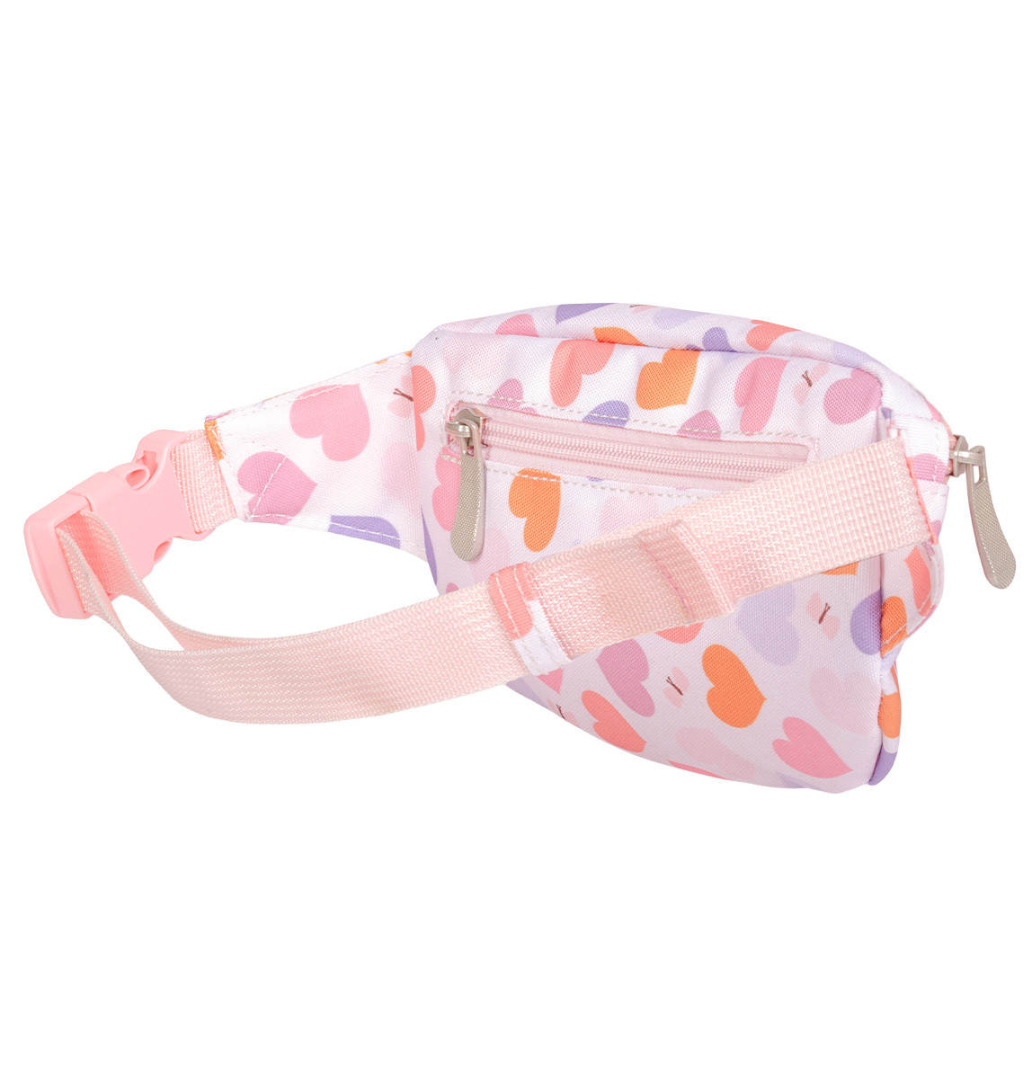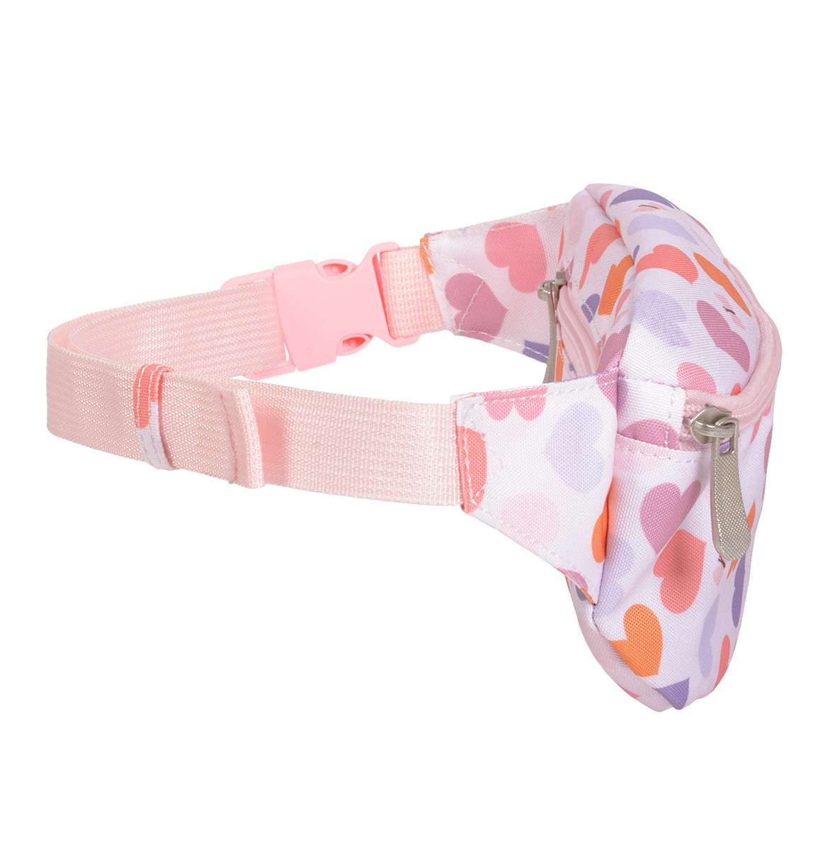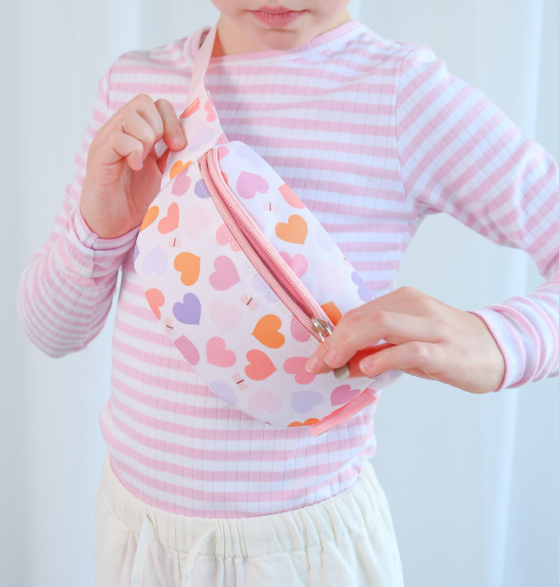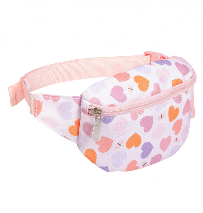 Dětská ledvinka s potiskem srdíček má nastavitelný popruh. Dá se nosit kolem pasu a lze jí použít i jako crossbody kabelku. Do přední přihrádky se snadno vejde peněženka a mobilní telefon. Zadní kapsa na zip je ideální na drobné cennosti.