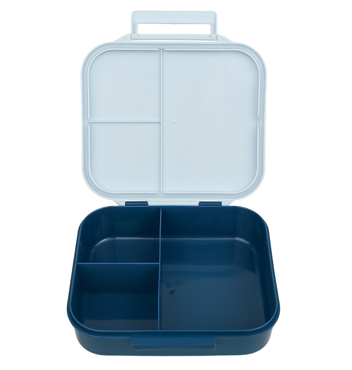 Barevný svačinový box se třemi praktickými přihrádkami umožňuje oddělit různé druhy potravin, aby zůstaly čerstvé a chutné. Víko na pantech a silikonové těsnění zaručují bezpečné uzavření, které pomáhá zabránit úniku obsahu krabičky.