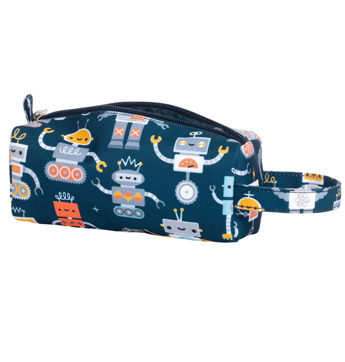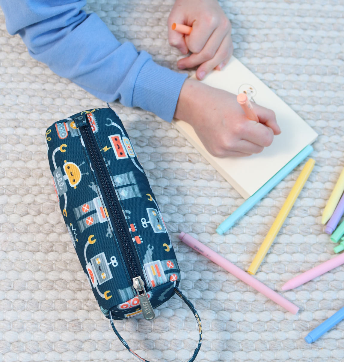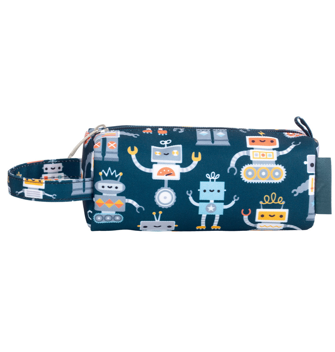 Pouzdro na pastelky, fixy nebo psací potřeby s potiskem robotů je vyrobené z odolného polyesteru. Je ideální na cesty, do školy nebo na kroužky. Pouzdro se zapíná na zip, je podšité a má pohodlnou rukojeť. Tento praktický penál pomůže dětem udržet jejich pera, tužky i pastelky bezpečně na jednom místě.