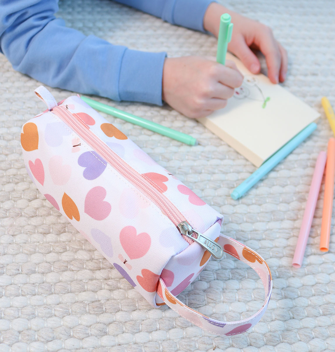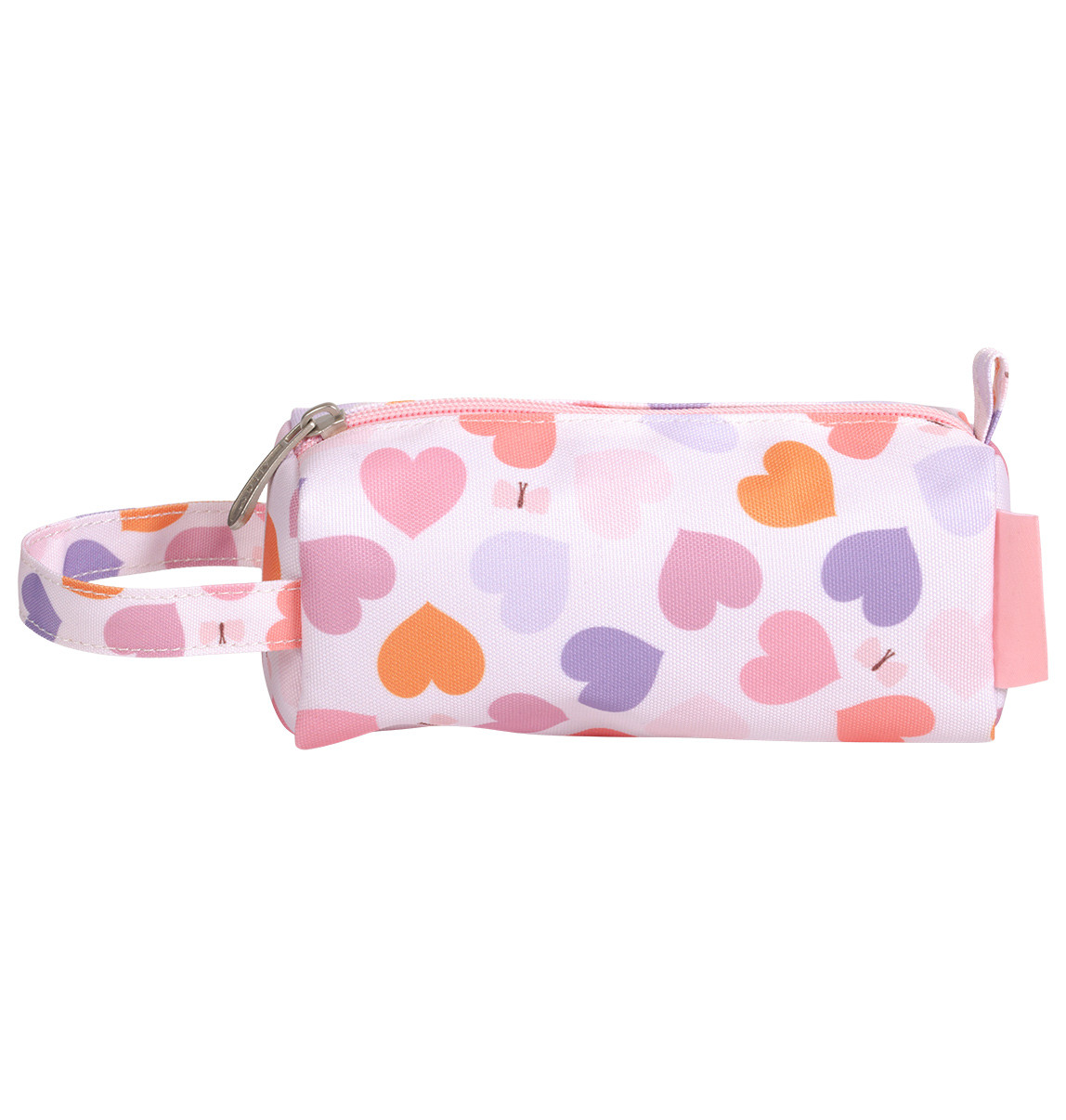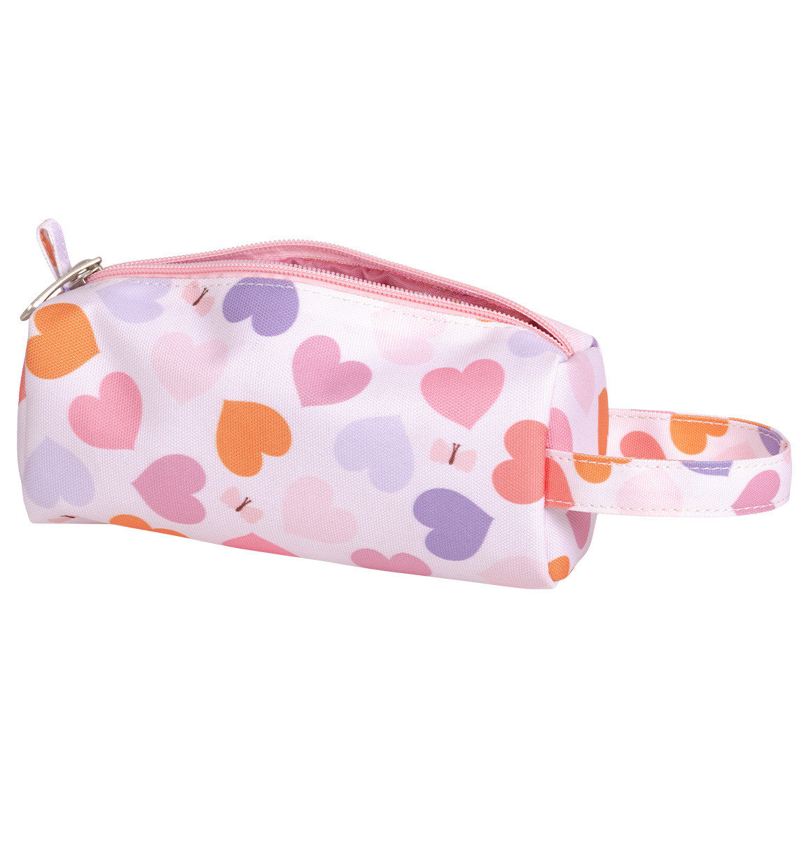 Pouzdro na pastelky, fixy nebo psací potřeby s potiskem srdíček je vyrobené z odolného polyesteru. Je ideální na cesty, do školy nebo na kroužky. Pouzdro se zapíná na zip, je podšité a má pohodlnou rukojeť. Tento praktický penál pomůže dětem udržet jejich pera, tužky i pastelky bezpečně na jednom místě.