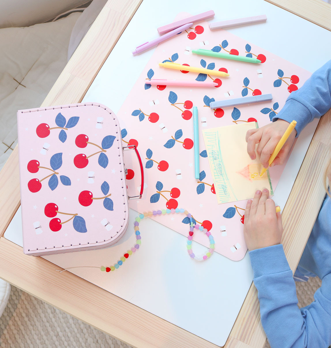 Sada dvou kartonových kufříků s motivem třešní. Kufříky jsou ideální pro ukládání předmětů a hraček. Poslouží i na uložení výtvarných potřeb. Sada obsahuje 2 různě velké kufříky vyrobené z odolného kartonu s polyesterovým prošíváním. Oba jsou vybaveny kovovým madlem a sponou pro zajištění kufru.
