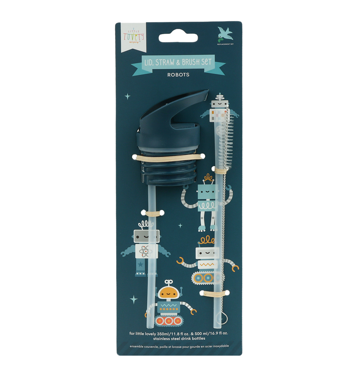 Sada skládající se z uzávěru, kartáčku a brčka pro nerezové láhve na pití o objemu 350 ml a 500 ml od značky A Little Lovely Company.