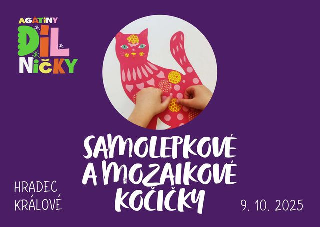 Zveme vás do Agátiny kreativní dílničky. Přijďte si s námi vytvořit dva originální obrázky pomocí samolepek a mozaiky. Na děti čeká roztomilá kočička a sladký dortíček. Oba obrázky si děti vyzdobí buď podle předlohy, nebo dle vlastní fantazie. Hotové výrobky se budou krásně vyjímat na poličce dětského pokojíčku. Tyto aktivity rozvíjí jemnou motoriku, fantazii a barevné cítění. Vytvořené výrobky si děti odnesou s sebou domů.