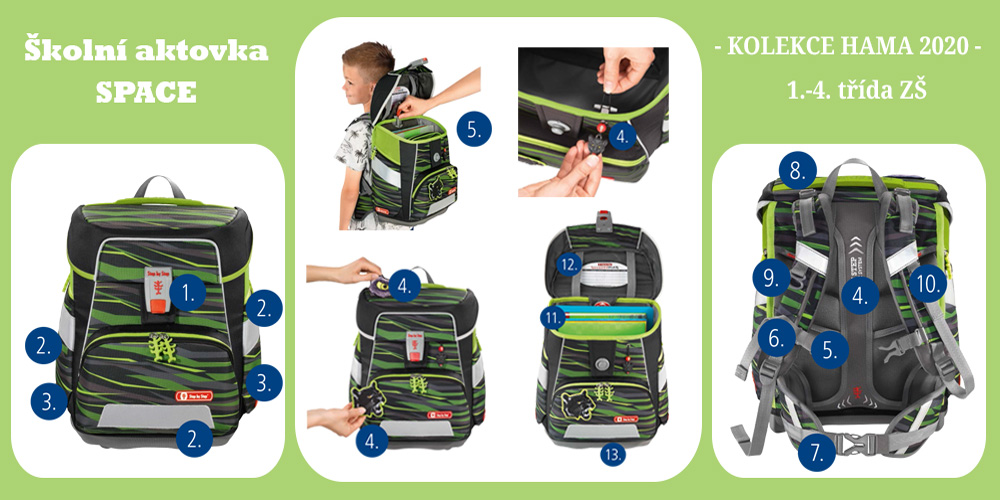 Hama přichází v roce 2020 s několika zajímavými novinkami. Absolutní novinkou je elektronicky polohovatelný bederní pás. Pás si školák či školačka nastaví velmi jednodušše a to pouhým stisknutím tlačítka. Uvnitř je zabudovaný sensor, který bederní pás nahátne přesně na velikost dítěte. Nebude pak ani volný, ani příliš upnutý. Tuto vychytávku najdete u modelu E-Space.Druhou novinkou je vylepšení výškového nastavení ramenních popruhů pomocí otočného mechanismu uvnitř aktovky. Budete mít tak jistotu, že aktovka sedí přímo na zádech dítěte. Model Cloud disponuje tímto komfortním nastavením.