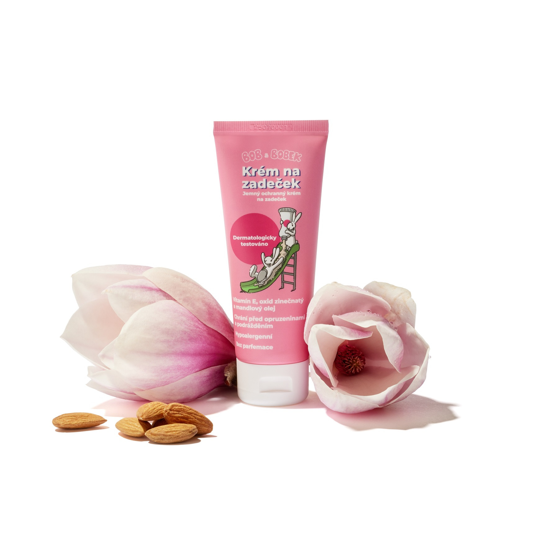Krém na zadeček obsahuje oxid zinečnatý, který na pokožce vytváří ochrannou vrstvu, má antiseptické vlastnosti a je odolný proti bakteriím a plísním. Nevšední složkou je extrakt z vilínovce virginského, který má protizánětlivé, antioxidační a antiseptické účinky, čímž je zajištěna opravdu důkladná péče o namáhanou pokožku v plenkové oblasti miminek. V neposlední řadě mandlový olej a bambucké máslo pokožku vyživují a hydratují. Krém na zadeček od Boba a Bobka je hypoalergenní, bez parfemace a samozřejmě dermatologicky testovaný.