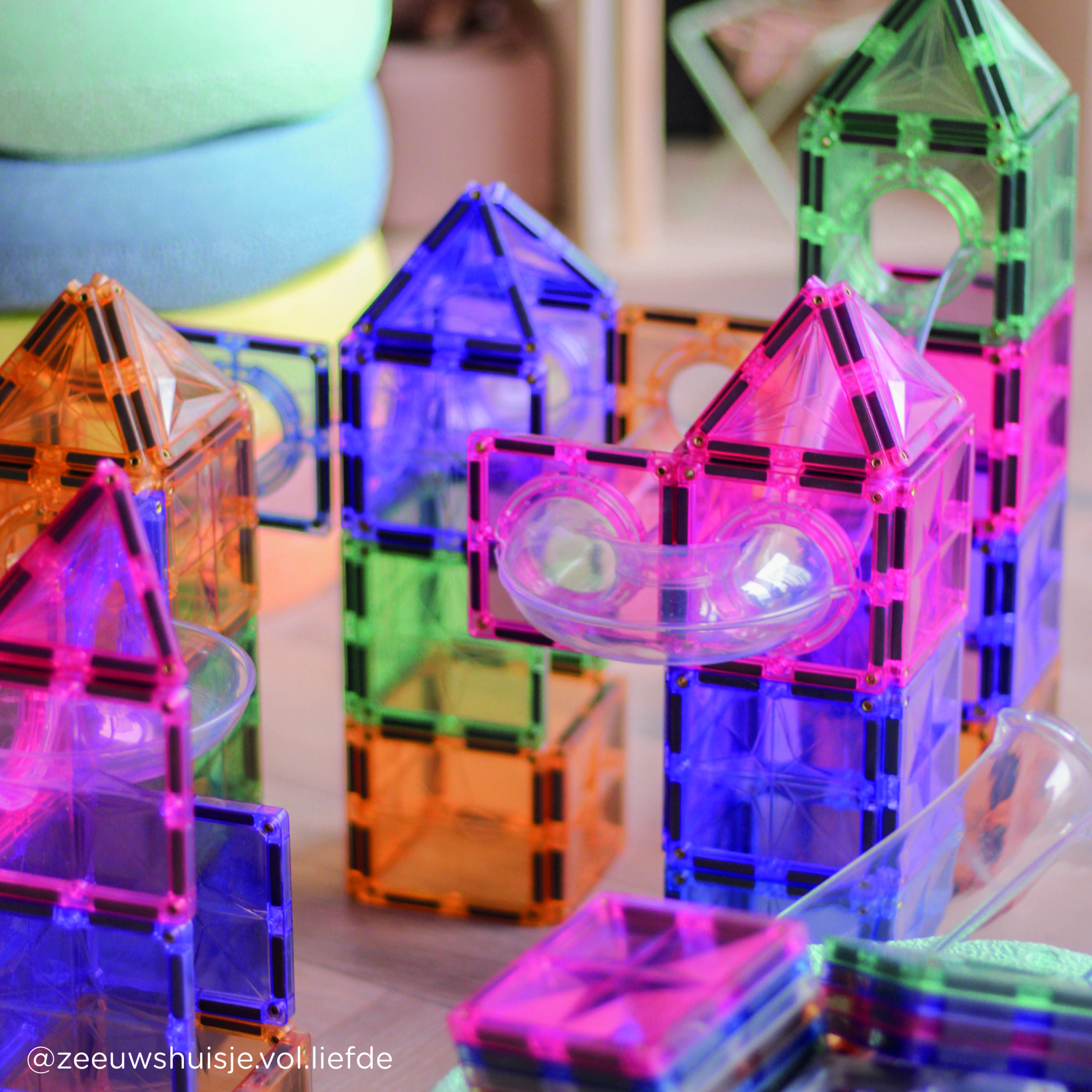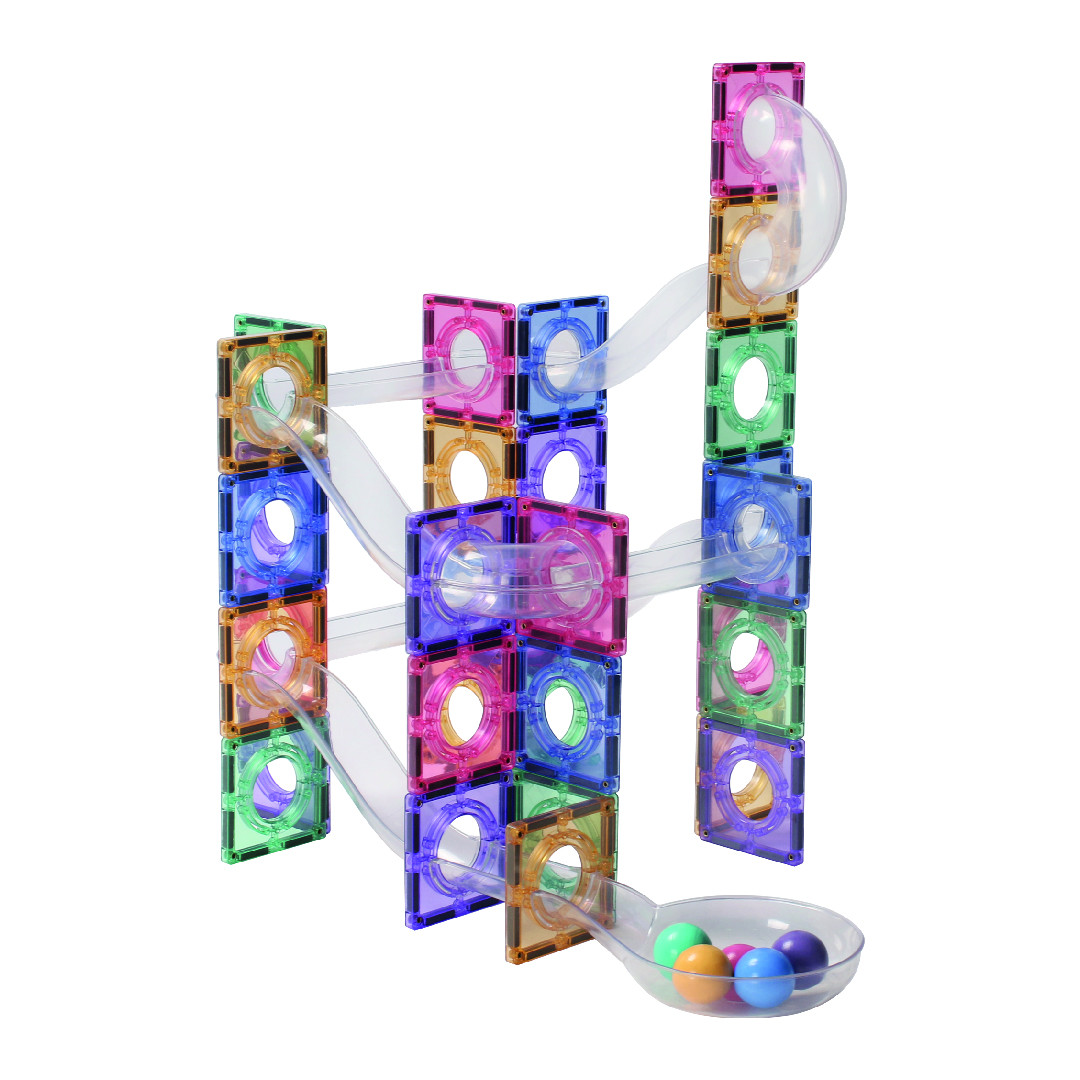 V balení najdete různé druhy magnetických dlaždic a různé typy trubek – rovné, zahnuté i vlnité, misky a samozřejmě také kuličky. Právě tato variabilita umožňuje vytvářet pokaždé úplně jinou dráhu a neustále objevovat nové možnosti hry. Hra se stavebnicí zároveň podporuje tzv. STEAM dovednosti (věda, technika, inženýrství, umění a matematika), rozvíjí jemnou motoriku a učí děti přemýšlet v souvislostech – a to zcela přirozeně, formou hry.