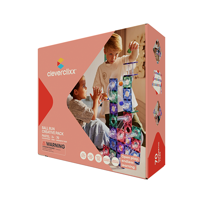 Magnetická kuličková dráha Cleverclixx Creative Pack v jemných pastelových barvách obsahuje 70 dílků a představuje ideální střední variantu mezi základní a velkou sadou. Nabízí dostatek prvků pro kreativní stavění i experimentování, a přitom zůstává přehledná a dobře kombinovatelná s dalšími sadami. V balení najdete pestrou kombinaci prvků pro tvorbu kuličkových drah, rovné i zahnuté trubky, vlnité části, dílky ve tvaru U, čtvercové základny, sběrnou misku i kuličky. Právě tahle variabilita umožňuje vytvářet pokaždé nové a originální dráhy.