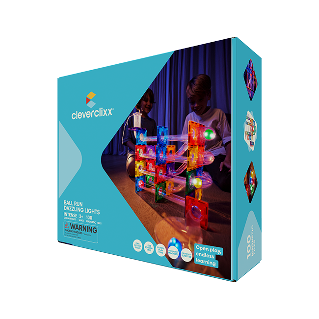 Magnetická kuličková dráha Cleverclixx Dazzling Lights Pack Intense obsahuje 100 dílků a posouvá klasickou stavebnici o úroveň výš, protože přidává světelný efekt, který děti okamžitě vtáhne do hry. Speciální kuličky při pohybu svítí, takže každá jízda po dráze se promění v malou světelnou show – čím rychleji jedou, tím intenzivněji blikají.