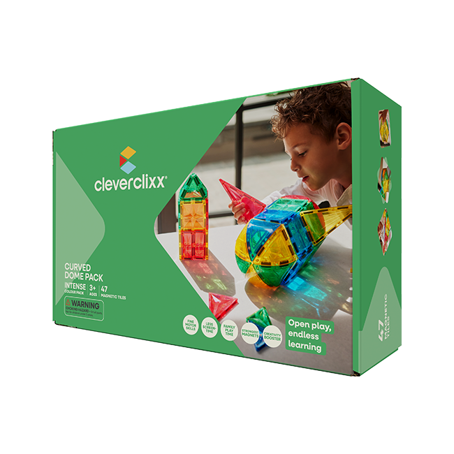 Magnetická stavebnice Cleverclixx Curved Dome Pack Intense obsahuje 47 dílků a přináší do světa magnetických stavebnic úplně nový prvek, unikátní zakřivené dílky. Díky nim děti snadno vytvoří kupole, oblouky nebo organické tvary, které s klasickými rovnými dílky jednoduše postavit nejdou.