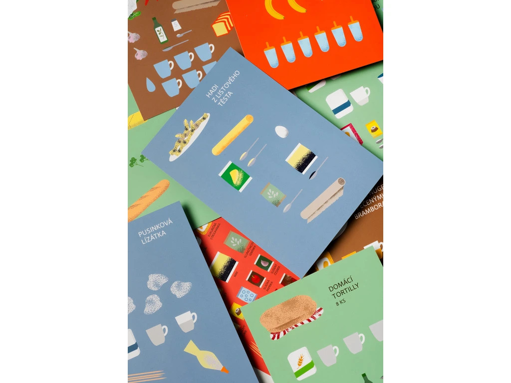 13 receptů na oboustranně potištěných listech (jedna strana seznam přísad, druhá strana postup)