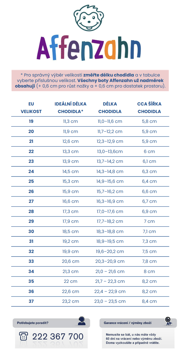 - Vyberte si správnou velikost barefoot botiček Affenzahn: