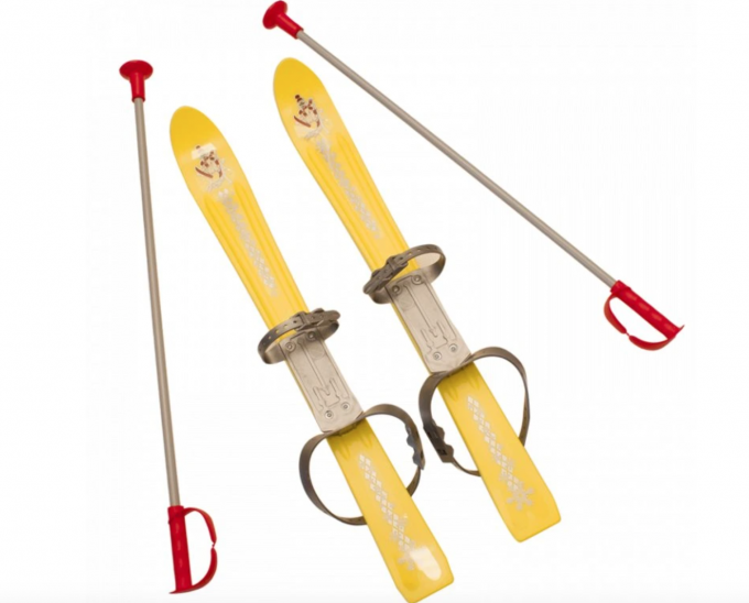 Lyže pro nejmenší začátečníky. Set: lyže + vázání + hůlky. Měkké plastové vázaní se přizpůsobí velikosti všech dětských bot. Lyže umožňují dělat drobné krůčky, takže se dítě naučí držet rovnováhu a základní pohyby na lyžích. Určeno pro děti cca od 3 do 6 let.