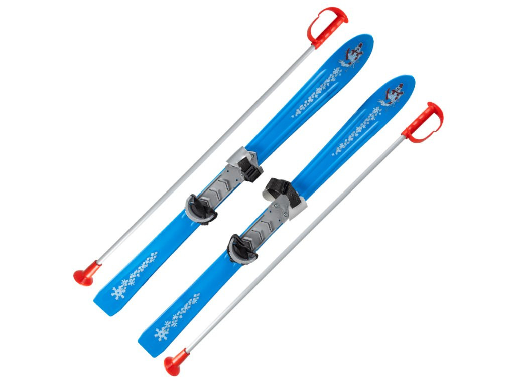 Lyže pro nejmenší začátečníky. Set: lyže + vázání + hůlky. Měkké plastové vázaní se přizpůsobí velikosti všech dětských bot. Lyže umožňují dělat drobné krůčky, takže se dítě naučí držet rovnováhu a základní pohyby na lyžích. Určeno pro děti cca od 3 do 6 let.