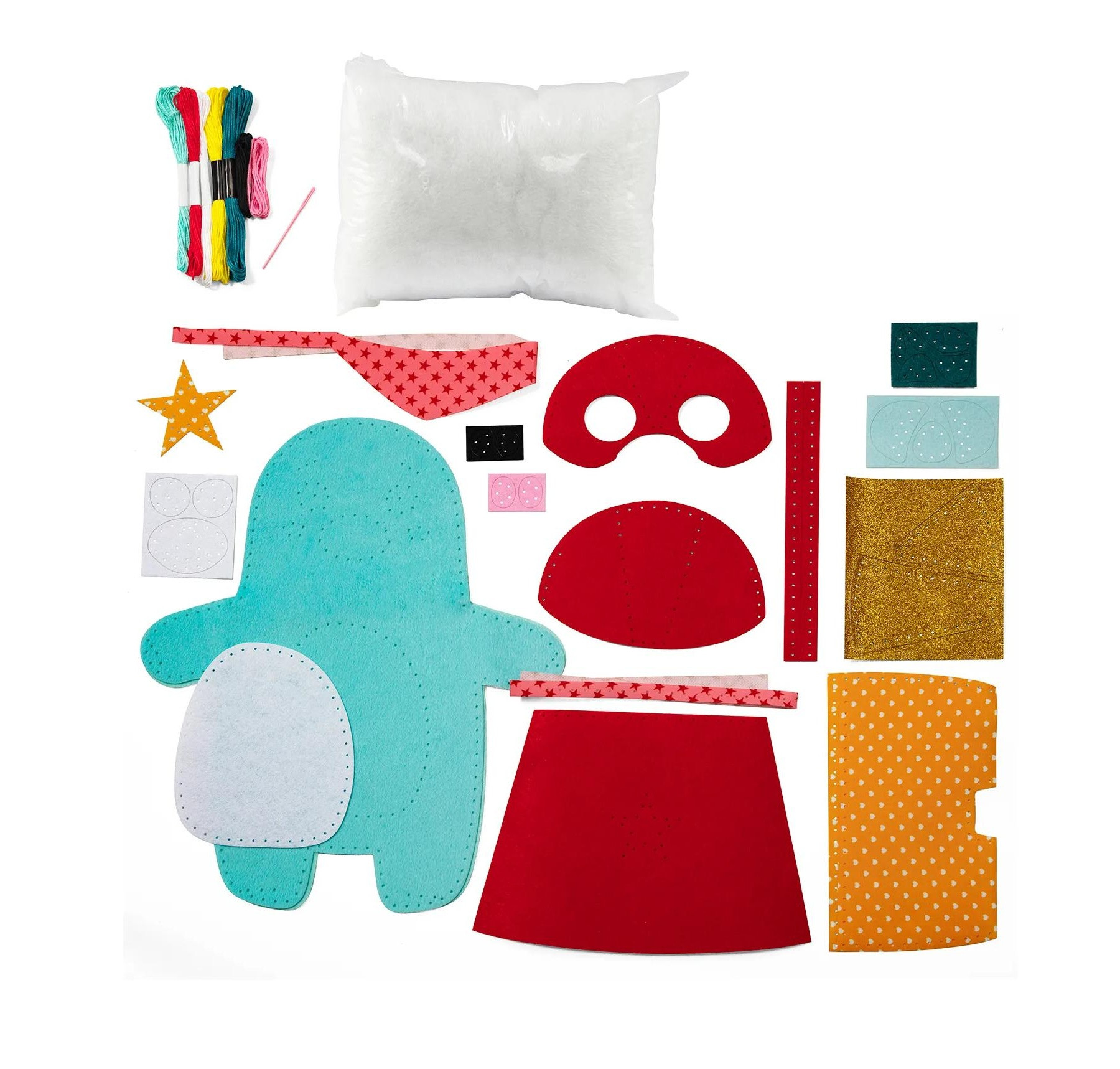 Sada dětské šití obsahuje vše potřebné k vytvoření hračky: předstřižené plstěné díly s perforací pro snadné šití, samolepicí části z plsti, výplň z vaty, plastovou jehlu a barevné nitě, přehledný obrázkový návod. Rozměry balení: 30 x 17,9 x 5 cm.
