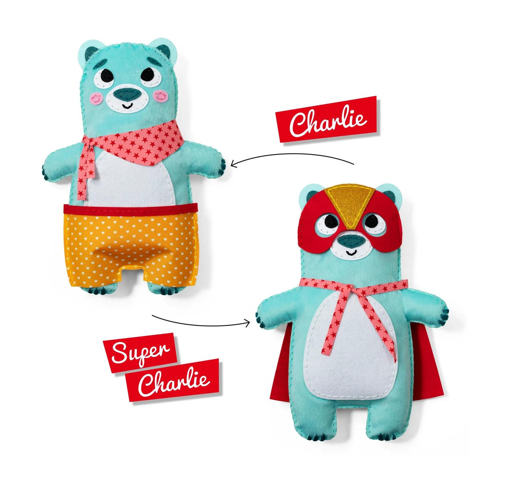 Medvěd Charlie je tvořivá sada, která děti zábavnou formou seznámí se základy šití. Díky předem připraveným dílkům z měkké barevné plsti si snadno vytvoří svou vlastní hračku – roztomilého medvídka, na kterého budou po dokončení náležitě pyšné. Malé dírky v materiálu usnadňují začátečníkům šití a bezpečná plastová jehla je ideální pro malé dětské ruce. Šití podporuje jemnou motoriku, soustředění a kreativitu. Vhodné pro děti od 6-10 let.