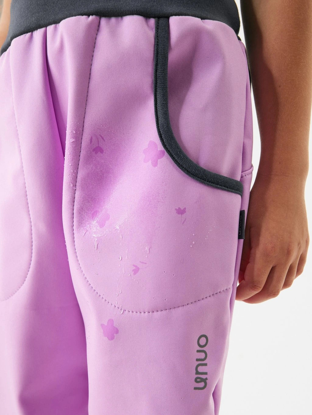 Tyto kalhoty se navíc chlubí jendím malým kouzlem, které si děti zamilují. Ve chvíli, kdy materiál přijde do kontaktu s vodou, objeví se na něm fialkové kytičky, které jsou za sucha neviditelné. V dešti se tak kalhoty doslova promění a každá procházka venku se rázem stane malým dobrodružstvím.