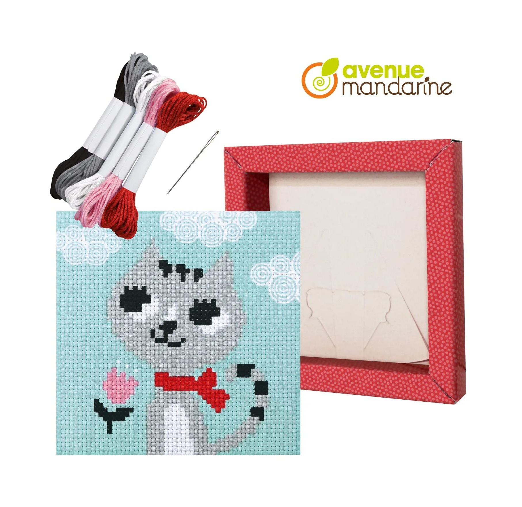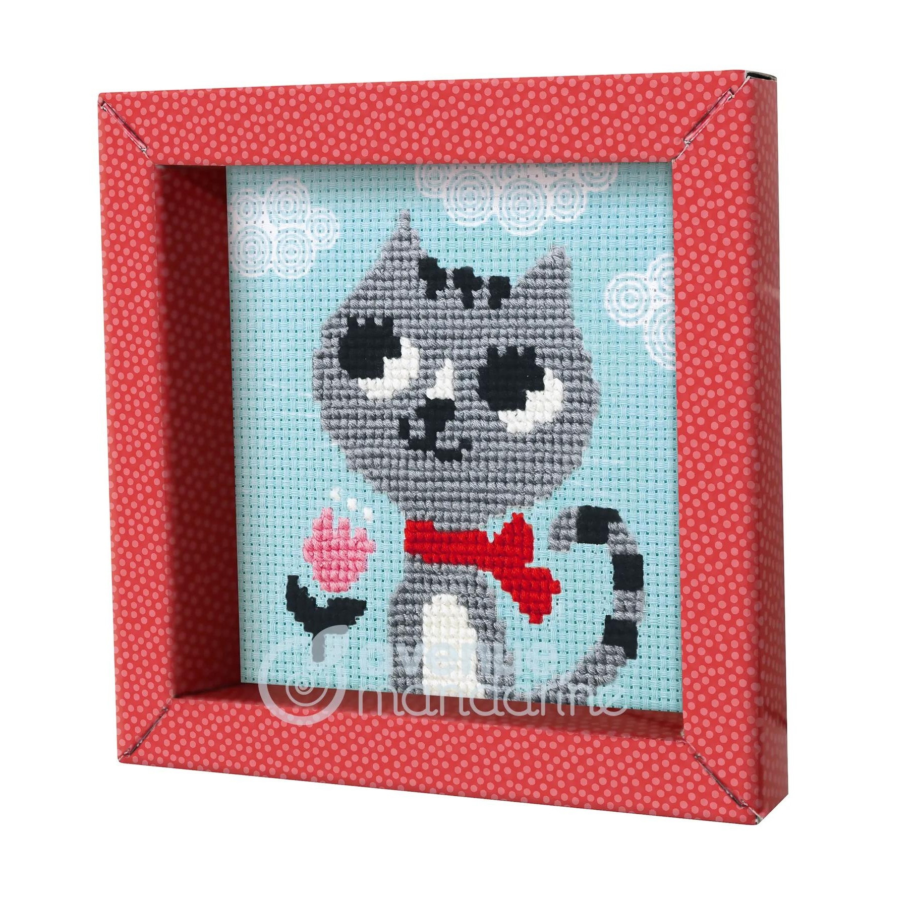 Obsah balení: předtištěná křížková vyšívací látka 12,7 x 12,7 cm, kartonový rámeček 14 x 2 x 14 cm, 5 různobarevných bavlnek, jehla.