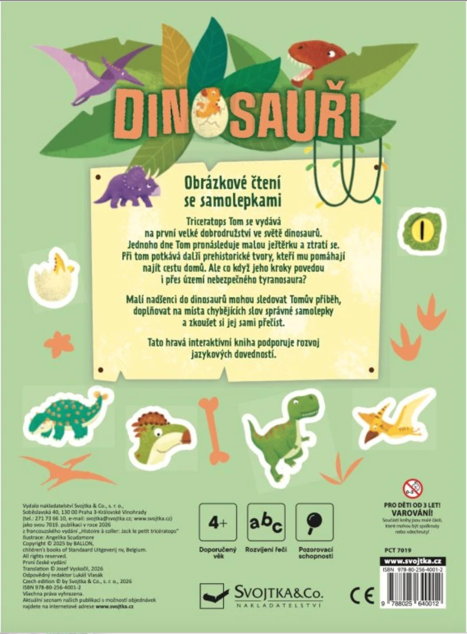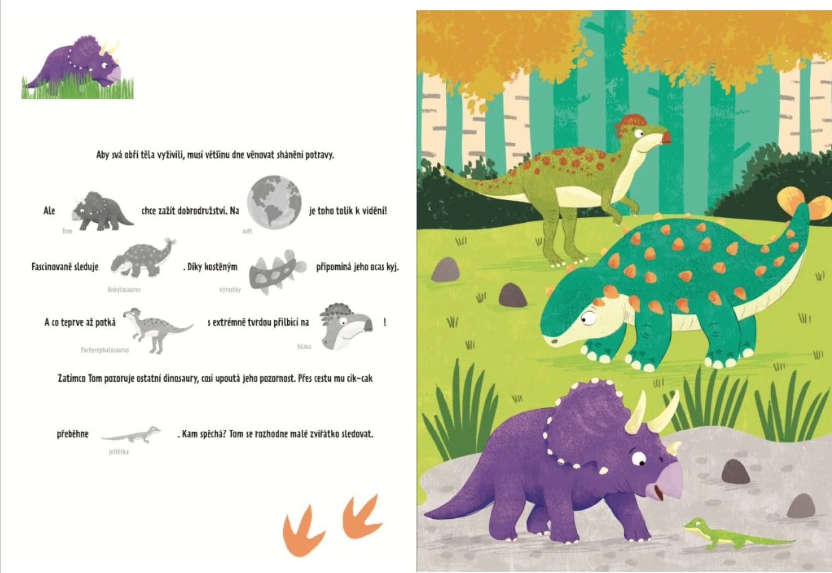 Děti při čtení sledují dobrodružství malého dinosaura, potkávají další prehistorické tvory a objevují jejich svět. Kombinace obrázků, textu a samolepek podporuje porozumění příběhu i první pokusy o samostatné čtení. Učení tak probíhá nenásilně a zábavnou formou.