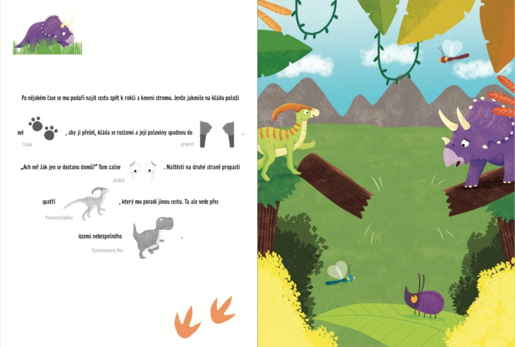 Vydej se na dobrodružnou výpravu do světa dinosaurů a pomoz malému triceratopsovi najít cestu domů. Knížka „Dinosauři – obrázkové čtení se samolepkami“ propojuje jednoduchý příběh s hravým čtením, kdy děti doplňují chybějící slova pomocí obrázků a samolepek. Díky tomu se přirozeně zapojují do děje a mají pocit, že příběh samy tvoří.