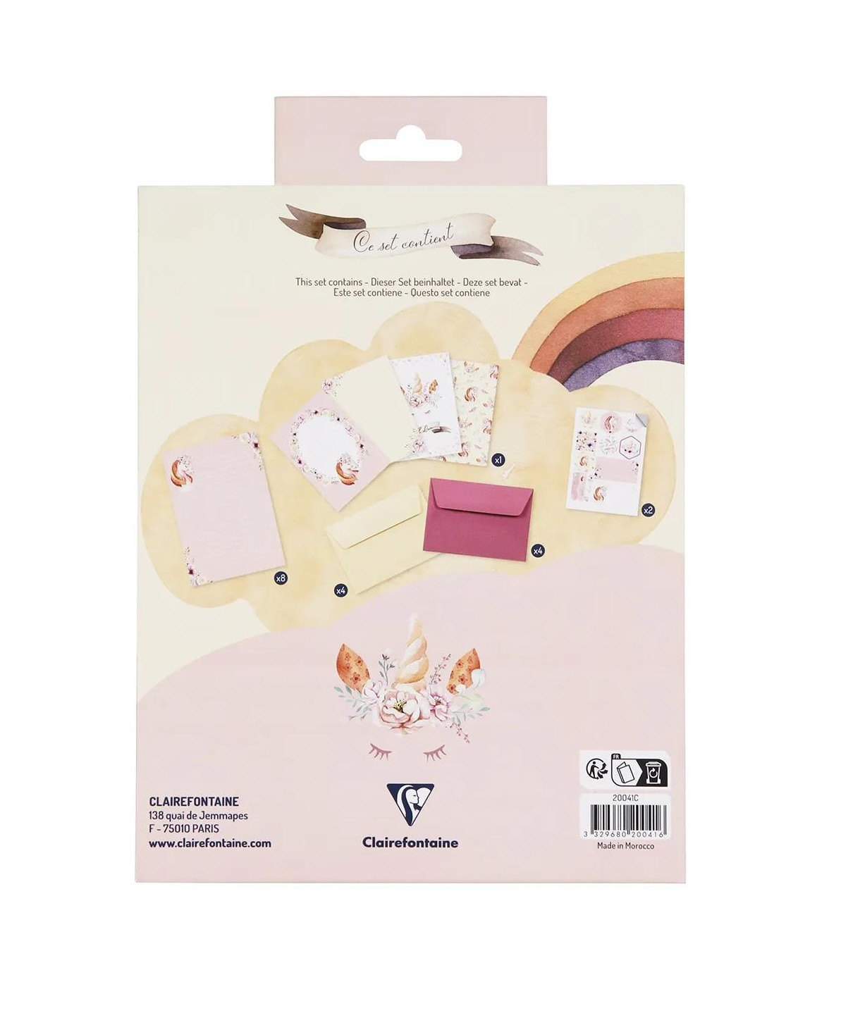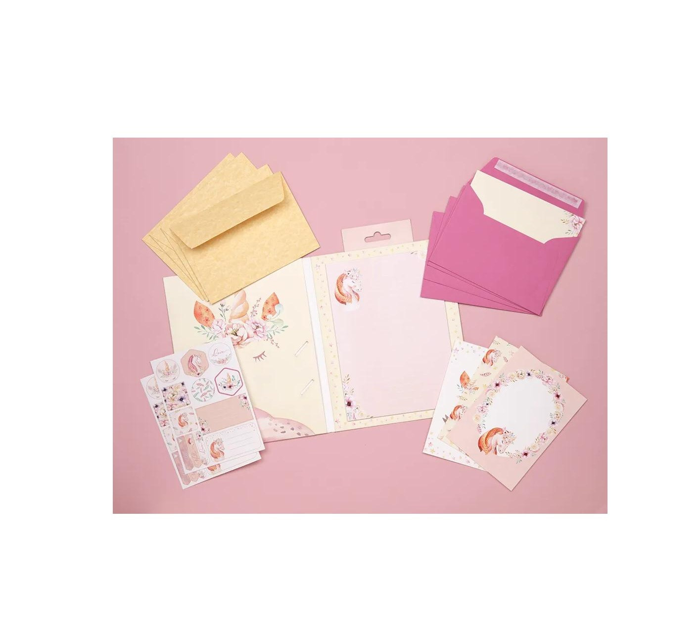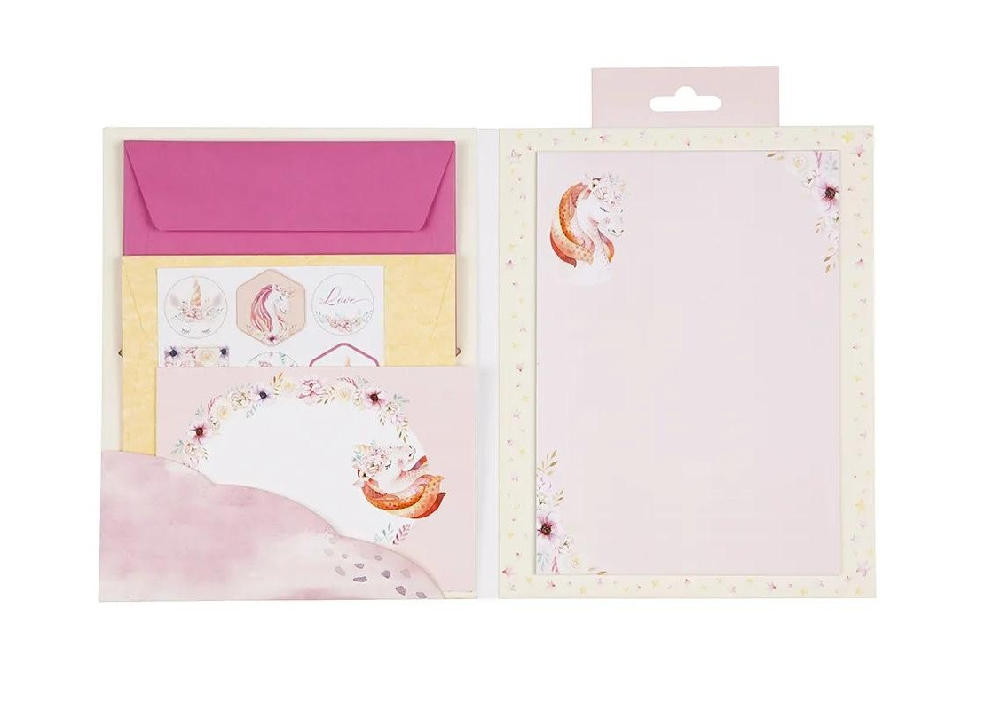 Korespondenční sada pro děti s motivem jednorožce obsahuje 8 listů dopisního papíru A5 (14,8 x 21 cm), 8 obálek C6 (2 různé barvy), 4 pohlednice s různými motivy (11 x 15,5 cm) a 2 archy samolepek. Ideální dárek pro děti, které rády píší a rády si dopisují se svými přáteli a rodinou.