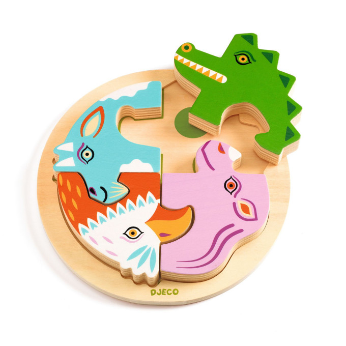 Dřevěné puzzle s motivem zvířátek se snadno skládá. Čtyři zvířátka tvoří kruh, dítě je umisťuje podle vnějšího výřezu a čar na spodní straně, čímž si rozvíjí vnímání tvarů a koordinaci pohybů. Dílky skládačky jsou dostatečně velké a uzpůsobené pro malé dětské ručičky. Zvířátka mohou stát vzpřímeně, děti si s nimi mohou hrát samostatně, když je přestane bavit skládačka. Určeno pro děti od 2 let.