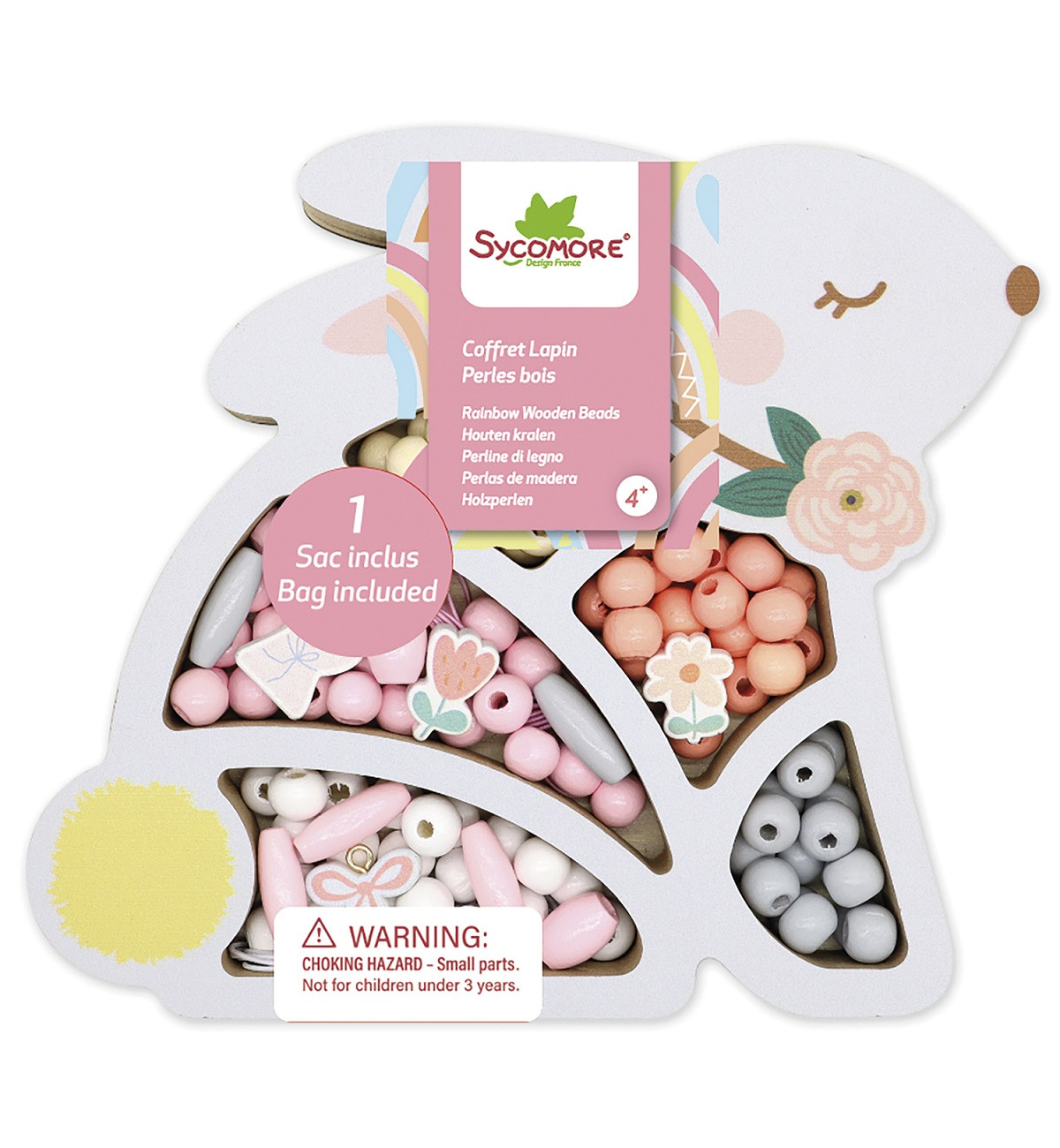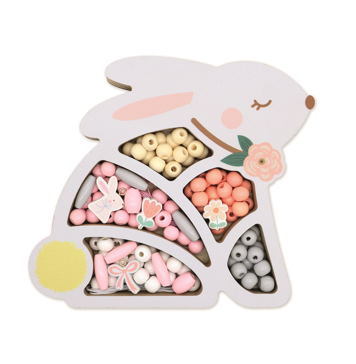 V atraktivním balení najdete dřevěné korálky v pastelových barvách, oválné korálky, přívěsky ve tvaru králíka a mašle, korálky ve tvaru květin, 3 metry provázku, sáček z organzy na uložení korálků.