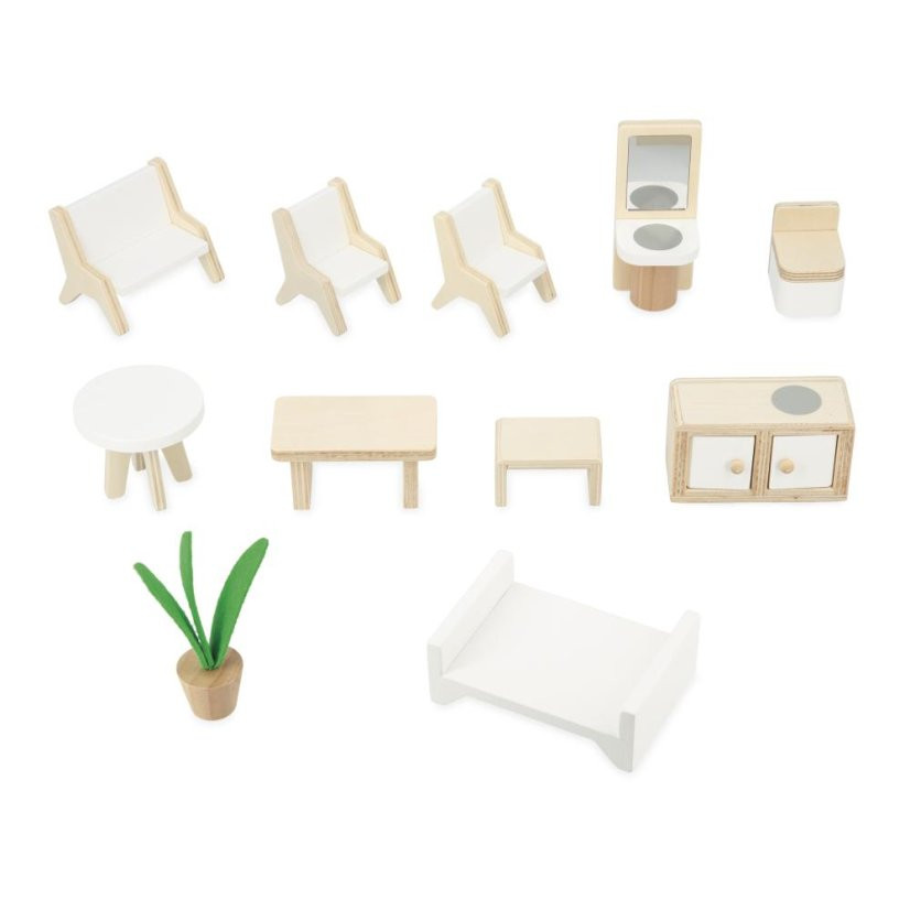 Přivítejte vaše malé panenky v novém domově! Dřevěný 3patrový dům s moderním nábytkem poskytne panenkám veškeré pohodlí. Pohodlný dům je vybaven 11 dřevěnými doplňky: pohovka, malý stolek a zelená rostlina do obývacího pokoje, kulatý stůl, židle a skříňka do jídelny, postel, židle a velký stůl do ložnice, umyvadlo, zrcadlo a WC do koupelny. Podkroví v posledním patře lze dovybavit nebo vyzdobit dle přání malého majitele. Domeček je vhodný pro panenky do velikosti 12 cm. Je vyroben ze dřeva s certifikací FSC®. Střízlivý a nadčasový vzhled tohoto hezkého domečku z něj dělá ideální hračku pro rozvoj představivosti.