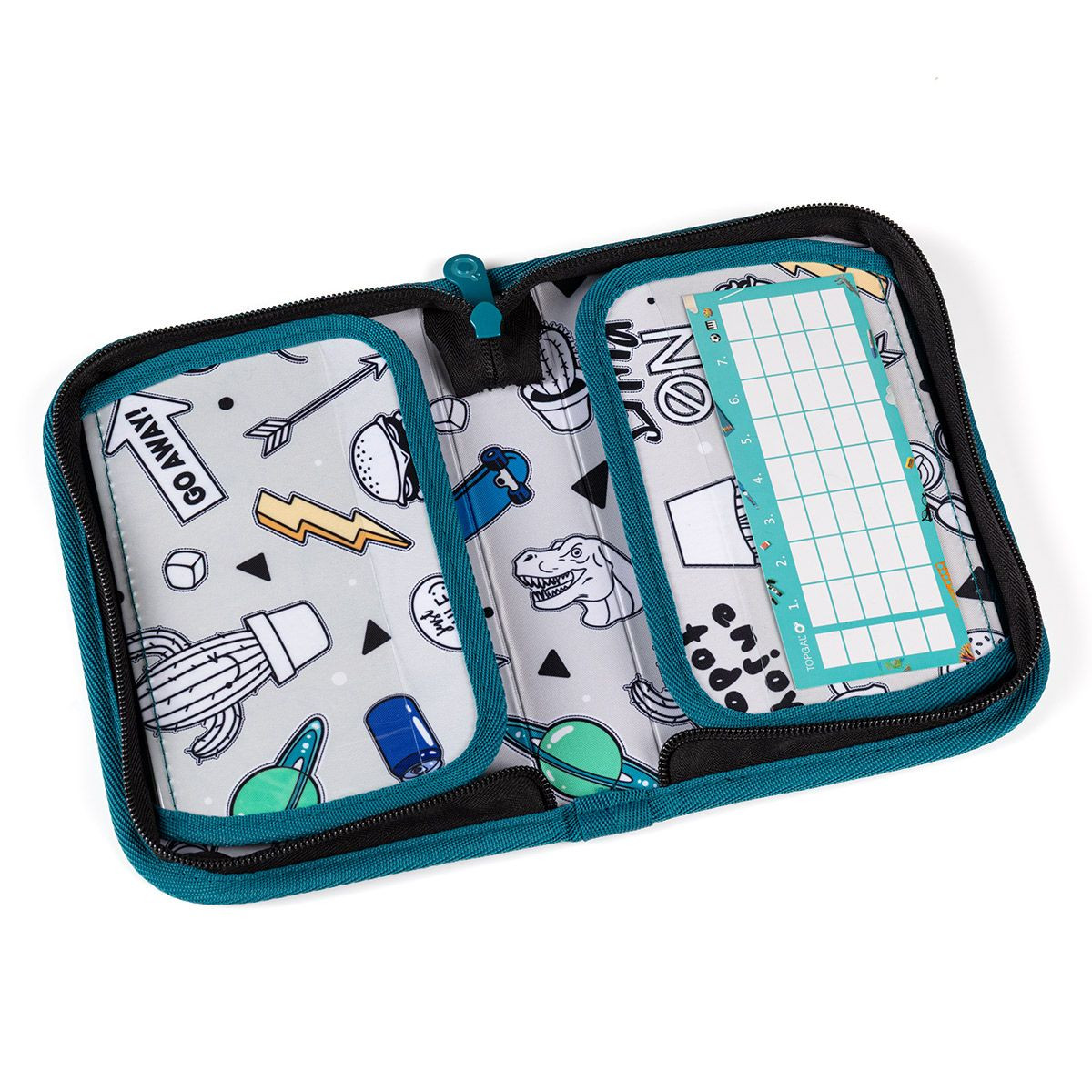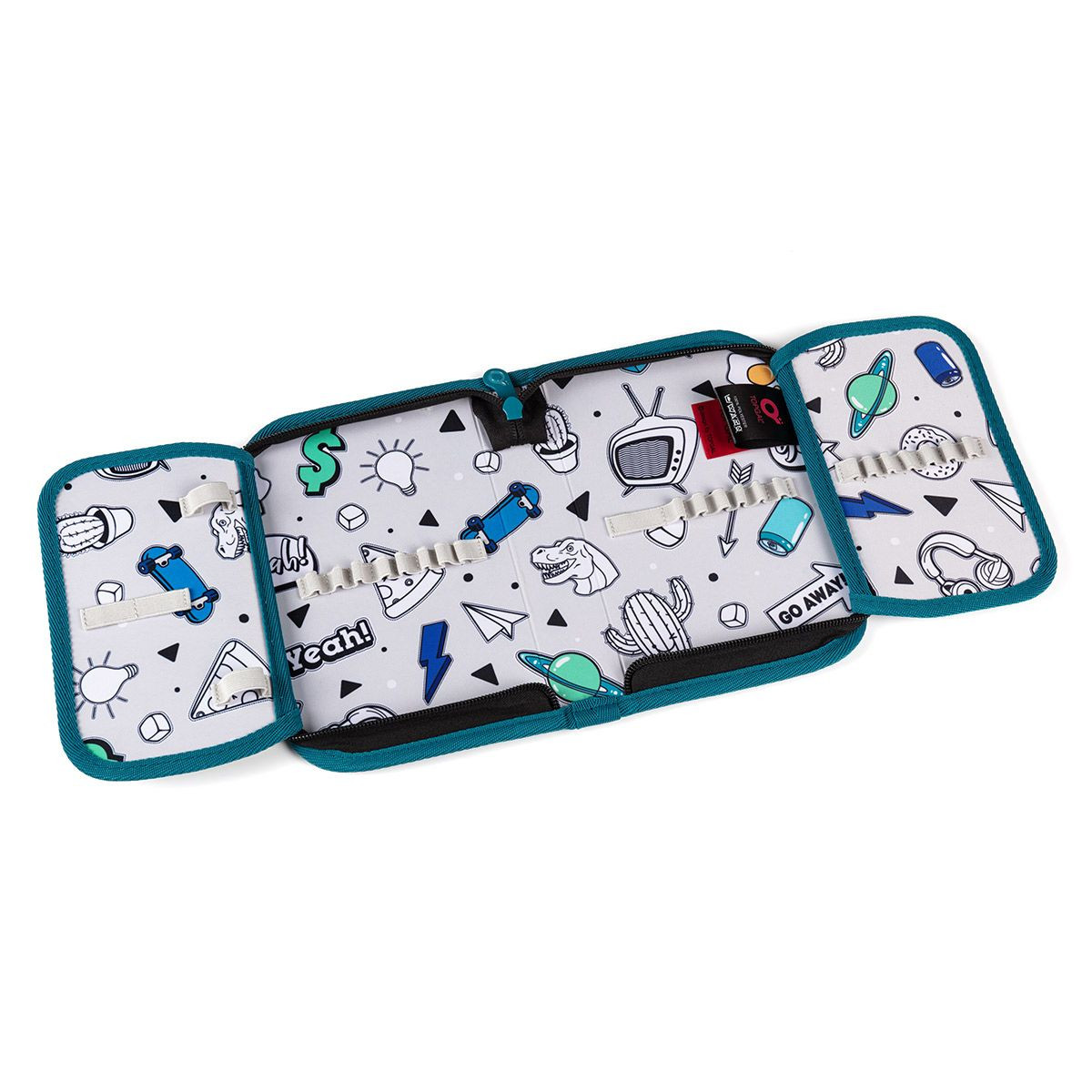 Jednopatrové školní pouzdro se dvěma klopnami je vybaveno 21 klasickými gumovými úchyty na pastelky a fixy, třemi širšími úchyty na pravítko, kružítko či nůžky a dvěma většími úchyty na gumu a ořezávátko. Pod klopou z průhledné folie najdete rozvrh hodin, druhé poslouží třeba i na taháky.