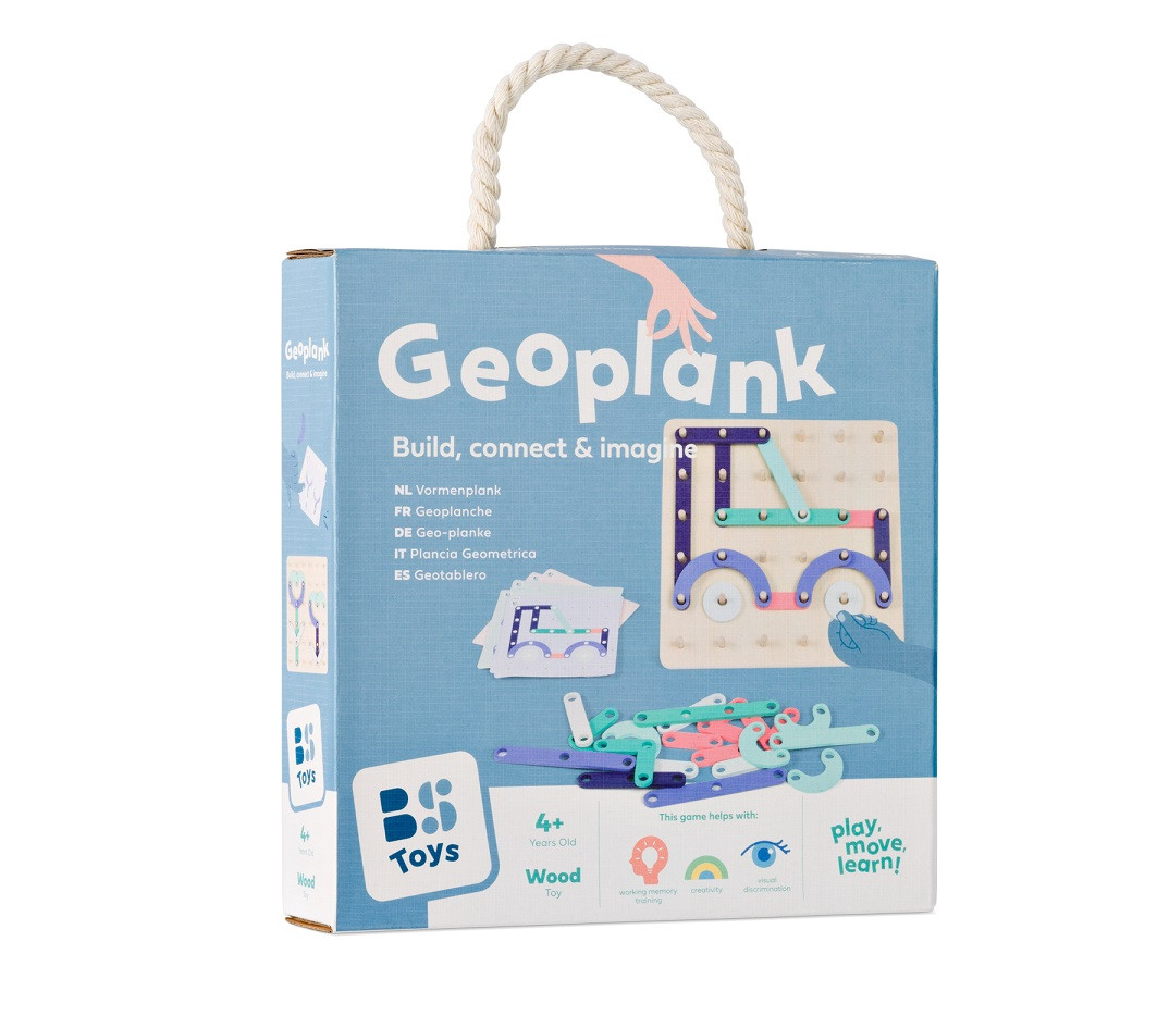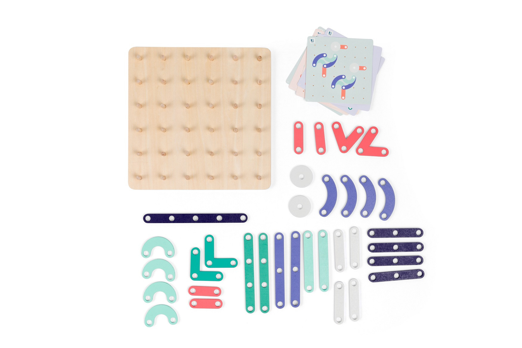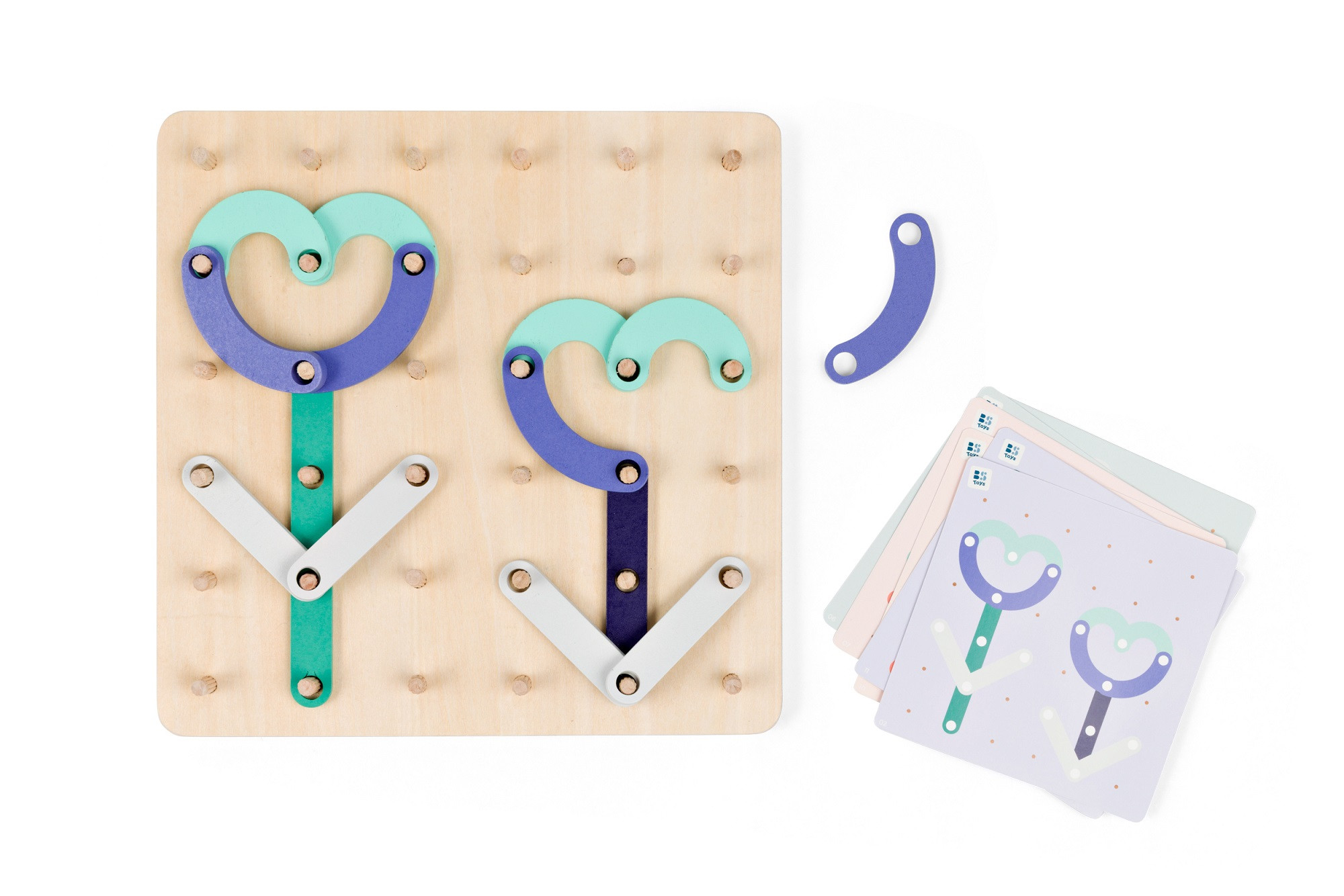 Obsah balení: dřevěná základna 21 × 21 cm, 6 karet s 12 vzory 10×10 cm, 33 dřevěných dílků. Dřevo pochází z odpovědně obhospodařovaných zdrojů.