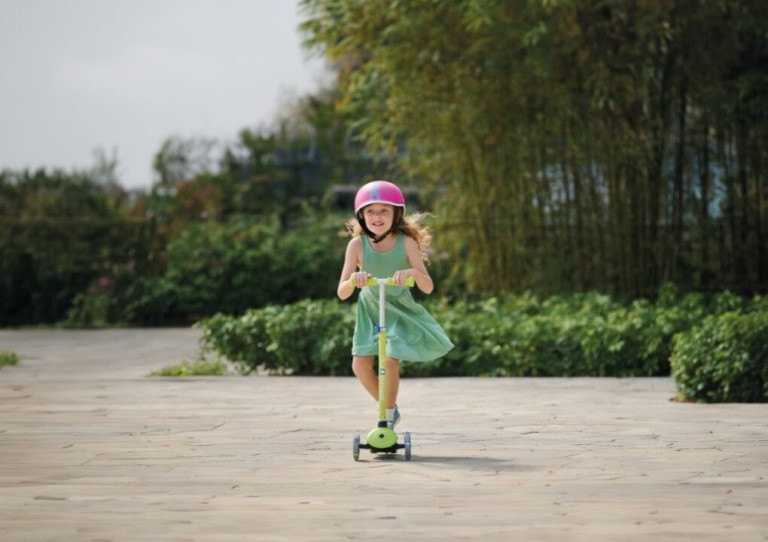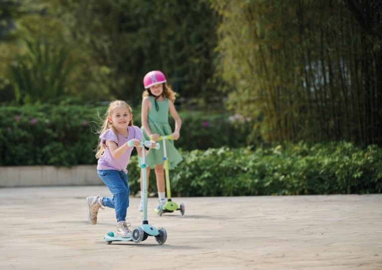 Bezpečnost a stabilitu zajišťuje nízká vyztužená deska s protiskluzovým dvousložkovým povrchem a dvoubarevným designem. Pro začátečníky je k dispozici patentovaný systém zámku řízení, který zafixuje kola v přímém směru, aby se dítě mohlo soustředit na nácvik rovnováhy. Jakmile jezdec získá jistotu, zámek lze snadno uvolnit a užívat si plnohodnotné zatáčení pomocí náklonu.