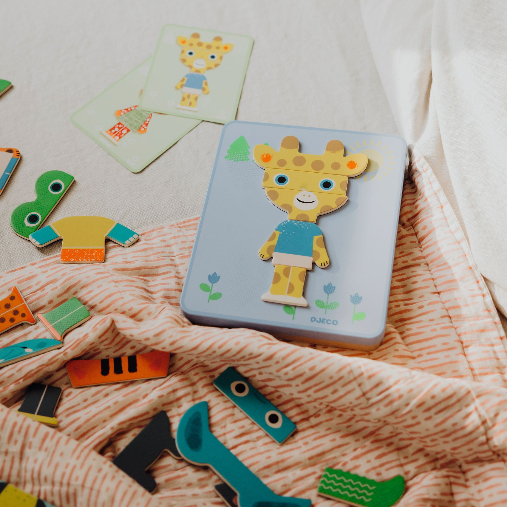 Magnetická zábavná hra, ve které si děti od 3 let vytvářejí zvířátka pomocí dřevěných magnetů na kovové krabičce. Na tenké kovové krabičce mohou sestavit 12 různých zvířat podle šablon. Každá strana krabičky nabízí jiné prostředí, takže děti mají dvě možnosti hraní. Kvalitní dřevěné magnety se snadno používají a po hře je lze jednoduše uložit zpět do krabičky – ideální na cesty!