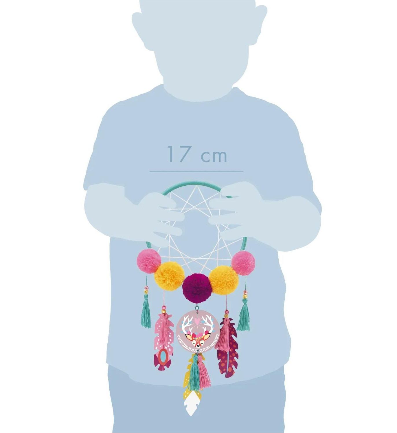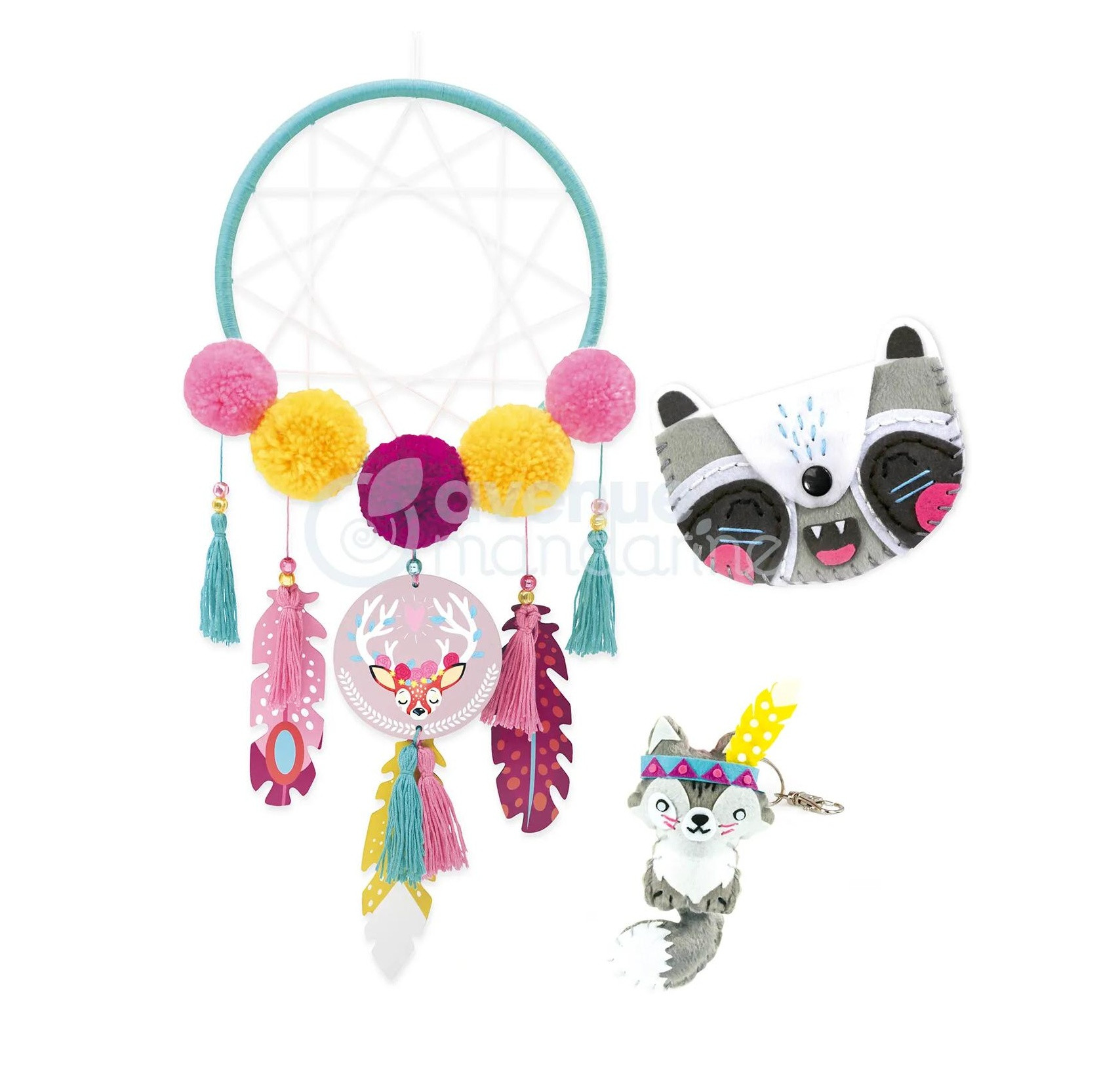 Sada obsahuje: šablony, kruh, vlnu, bavlnky, přívěsky a korálky k vytvoření lapače snů, předstřižené filcové díly, plastovou jehlu, bavlny a výplňový mateiál k vytvoření taštičky a přívěsku.