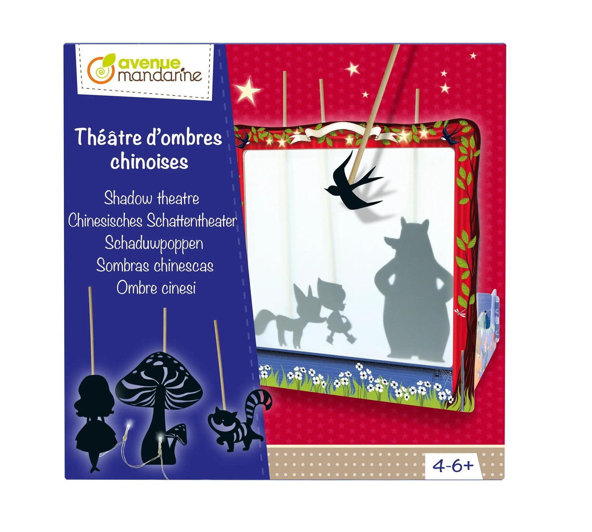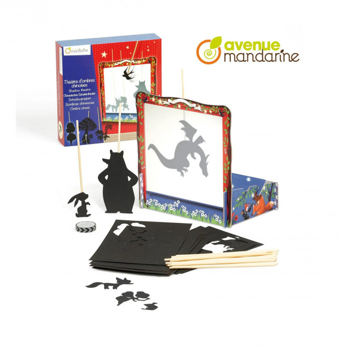Krásné stínové divadlo vám doma vykouzlí úžasnou atmosféru. Sada obsahuje vše potřebné k sestavení divadla: kartonové části s výřezy pro sestavení jeviště, 6 kartonových archů s 28 postavami, 28 dřevěných tyček pro vedení postav, světelnou girlandu pro osvětlení divadla (osvětelní s 5 LED diodami, baterie nejsou součástí výrobku) a lepící pásku. Stínové divadlo podněcuje u dětí představivost a kreativitu.