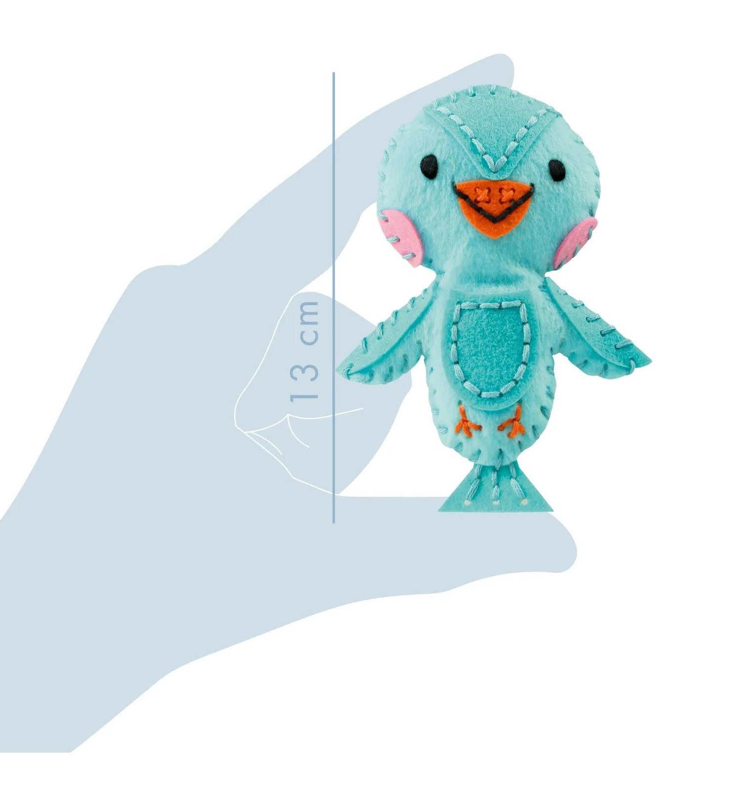 Sada obsahuje filcové části s předem připravenými dírkami pro snadné šití, bavlněné nitě, plastovou jehlu, výplňový materiál a kovový kroužek s karabinou.