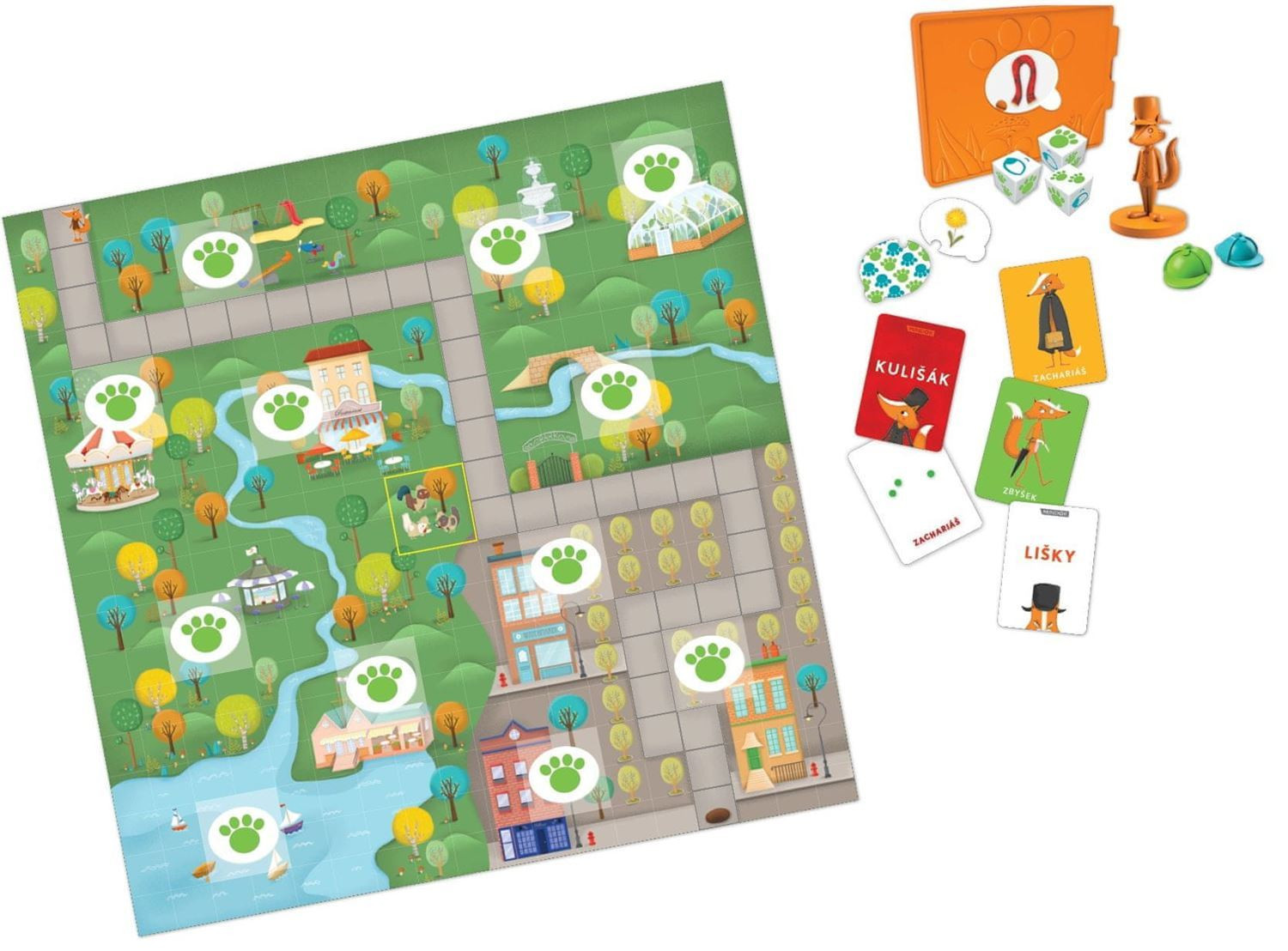Herní materiál: 16 karet lišek, 16 karet Kulišáků, 12 žetonů stop, 4 figurky detektivů, 3 speciální kostky, 1 figurku Kulišáka, 1 dekodér stop, 1 herní plán, česká a slovenská pravidla hry