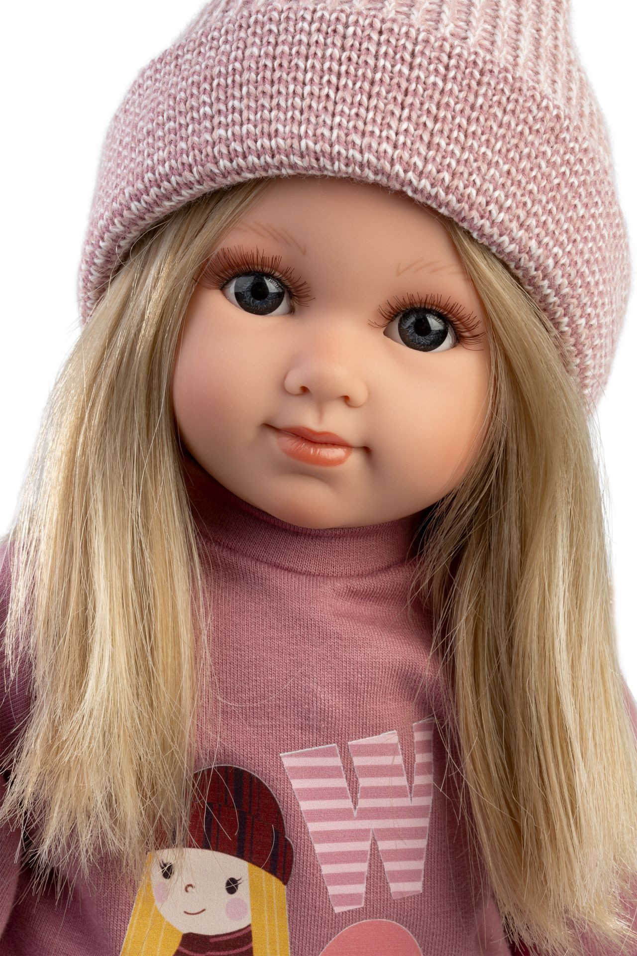 Panenka s měkkým látkovým tělem a s vlásky po celé hlavě, podobající se malé slečně. Velikost panenky je 35 cm. Ručně vyrobeno ve Španělsku, baleno v dárkové krabici.