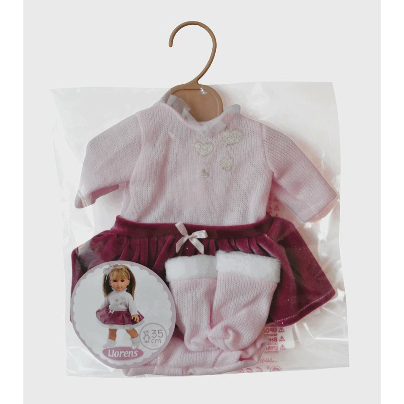 3dílný obleček pro panenku Llorens velikosti 35 cm. Vyrobeno ručně ve Španělsku, součástí balení je plastové ramínko.