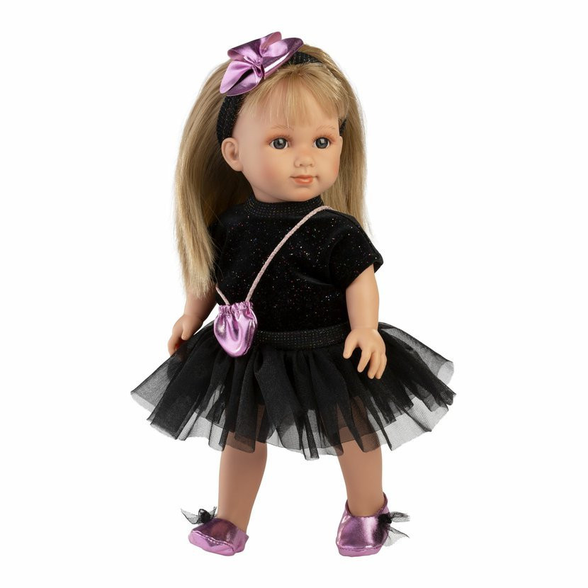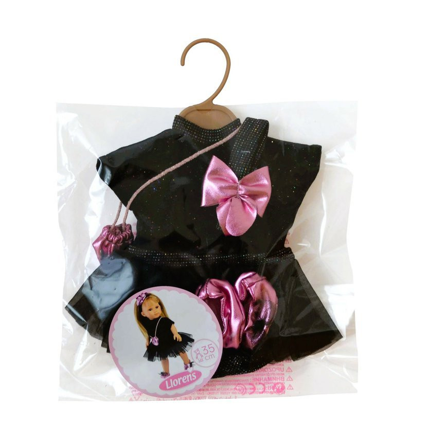 5dílný set: 3 kusy oblečení, ozdobná gumička s mašlí do vlásků a kabelka pro panenku Llorens velikosti 35 cm. Vyrobeno ručně ve Španělsku, součástí balení je plastové ramínko.