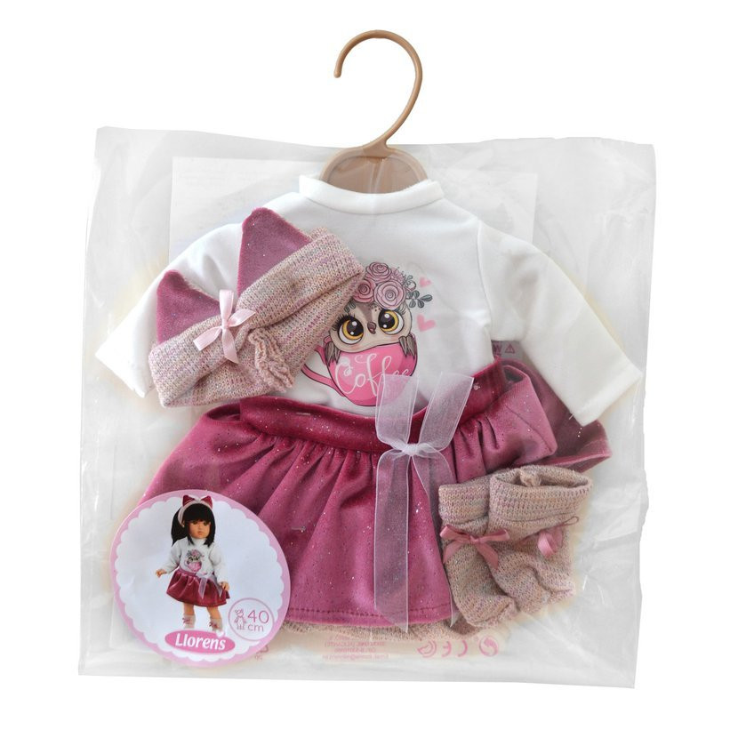 4dílný obleček pro panenku Llorens velikosti 40 cm. Vyrobeno ručně ve Španělsku, součástí balení je plastové ramínko.