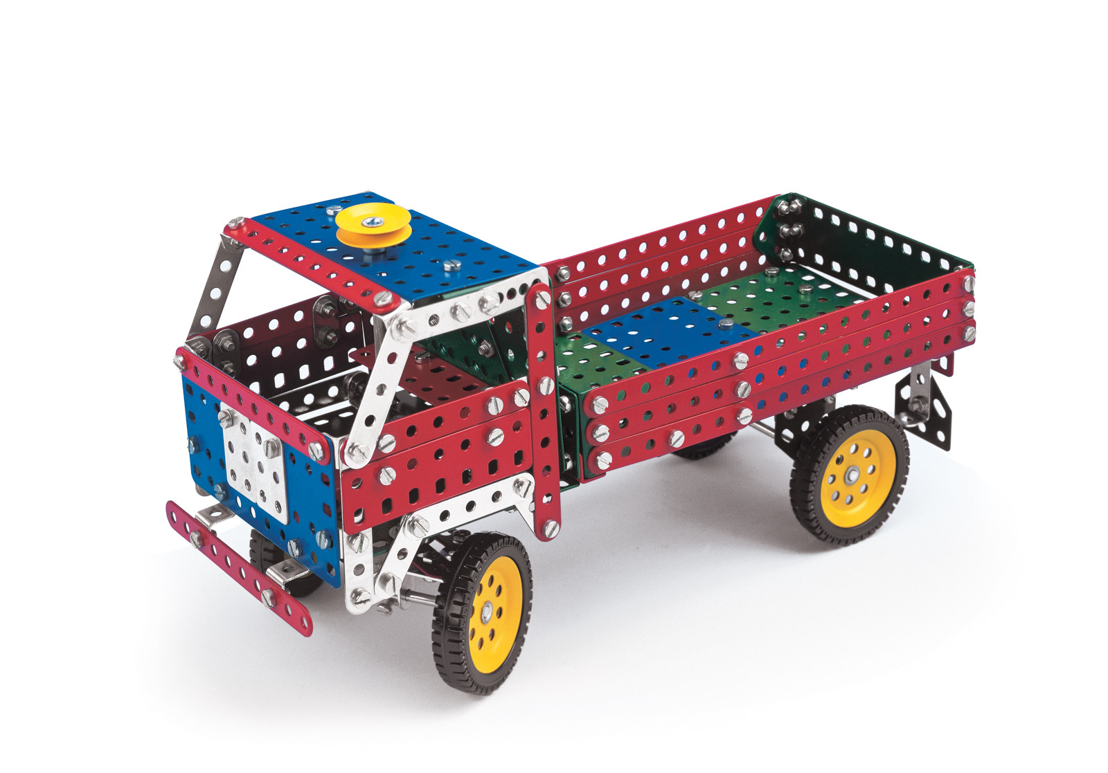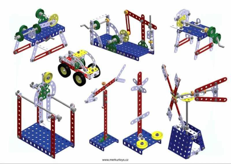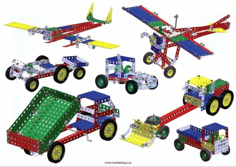 Dvouvrstvá klasická stavebnice Merkur 4 – velký set. Stavebnice obsahuje mimo základní sestavu dílů také součástky nutné pro stavbu nákladních automobilů, formulí a letadel. Součástí stavebnice je samozřejmě velká návodová knížka s návodem na stavbu 40 různých modelů jako je nákladní automobil, bugina, formule, jeřáb atd. Tato jedinečná sada je ideálním nástrojem pro rozvoj technických dovedností a představivosti dětí. Výhodou je, že zaujme nejen děti, ale i tatínky nebo dědečky. A společně strávený čas s dětmi nic nenahradí.