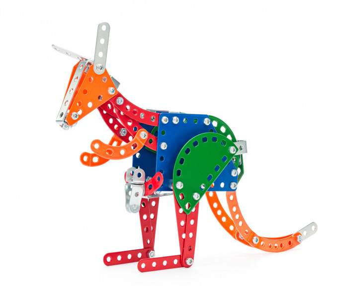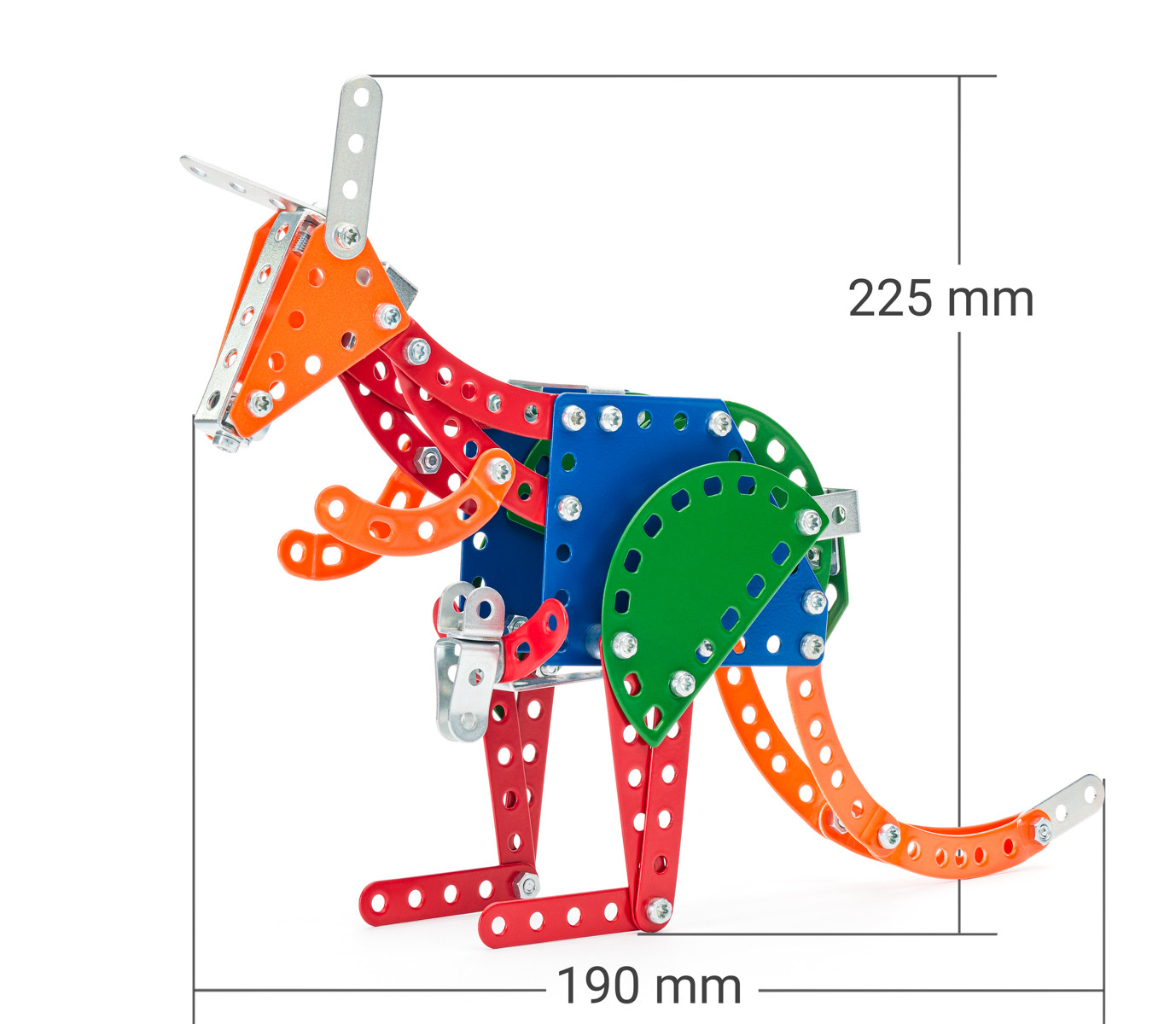Stavebnice Merkur pro děti od 5 let obsahuje potřebné součástky pro sestavení modelu klokana. V balení najdete podrobný návod a kvalitní kovové díly, které se snadno spojují šroubky. Stavebnici můžete sestavit podle přiloženého návodu nebo čistě podle svých představ. Se sestavenými modely si lze hrát, jsou velmi odolné. Stavebnice je určená pro děti od 5 let.