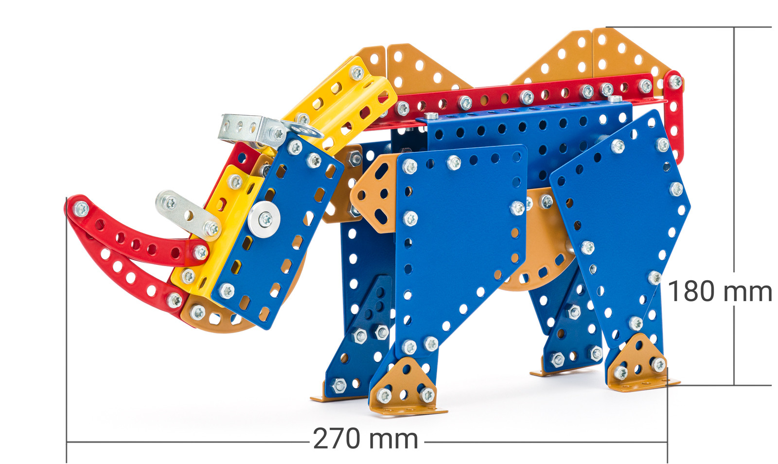 Stavebnice Merkur pro děti od 5 let obsahuje potřebné součástky pro sestavení modelu nosorožce. V balení najdete podrobný návod a kvalitní kovové díly, které se snadno spojují šroubky. Stavebnici můžete sestavit podle přiloženého návodu nebo čistě podle svých představ. Se sestavenými modely si lze hrát, jsou velmi odolné. Stavebnice je určená pro děti od 5 let.