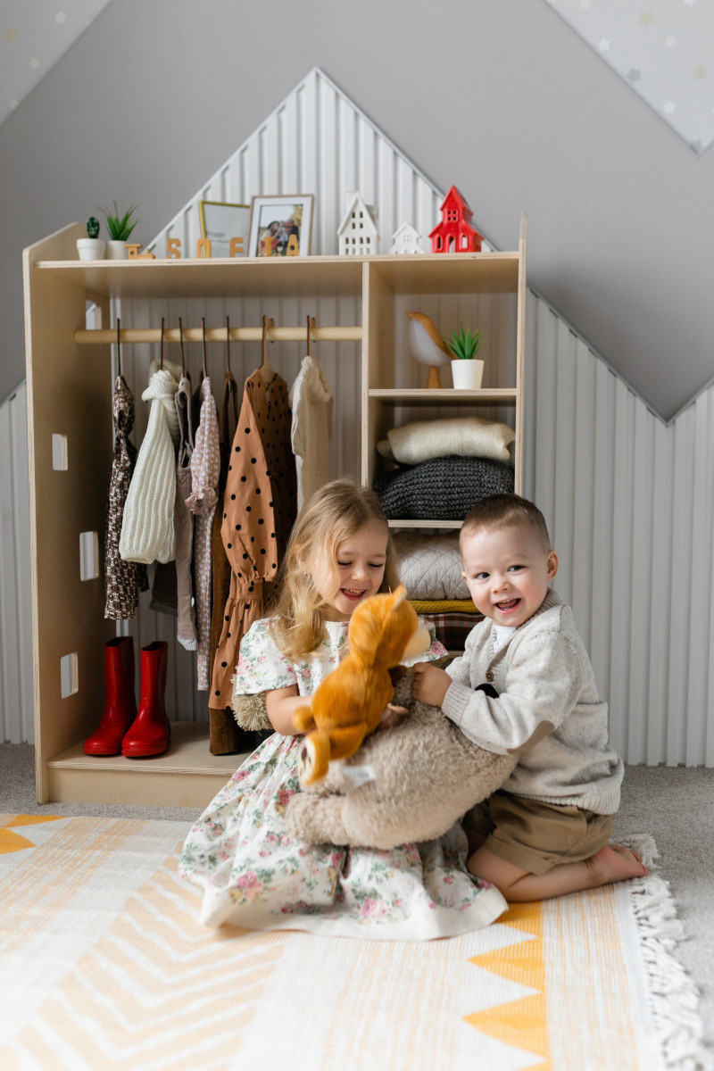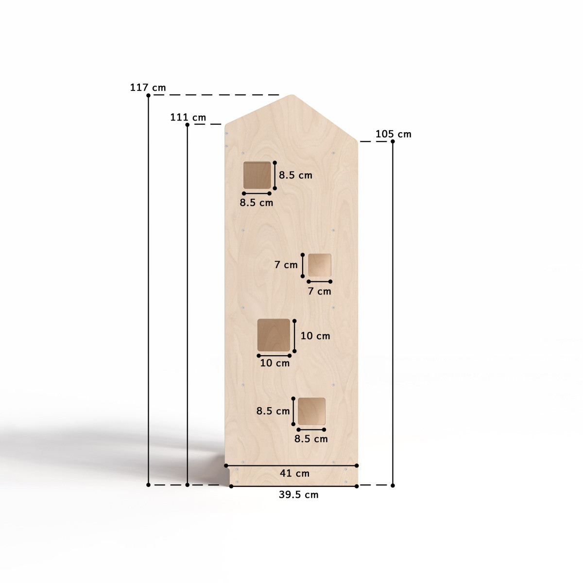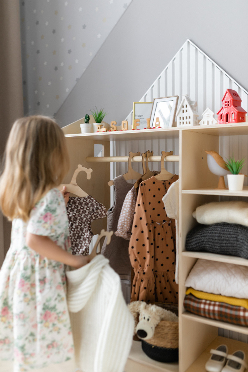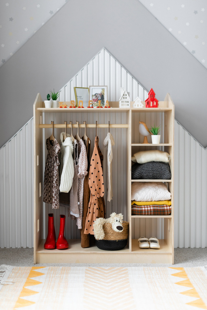 Dětská skříň pro snadnou organizaci dětského pokoje ve tvaru domečku. Skvěle doplní naše oblíbené úložné police na hračky a knihy ze stejné kolekce. Skříň je navržena podle principů Montessori. Díky otevřenému přístupu k policím se děti snadno naučí samostatně vybírat oblečení, udržovat pořádek a rozvíjet svou zodpovědnost. Tvar domečku zároveň vnáší do pokoje hravost a útulnou atmosféru.