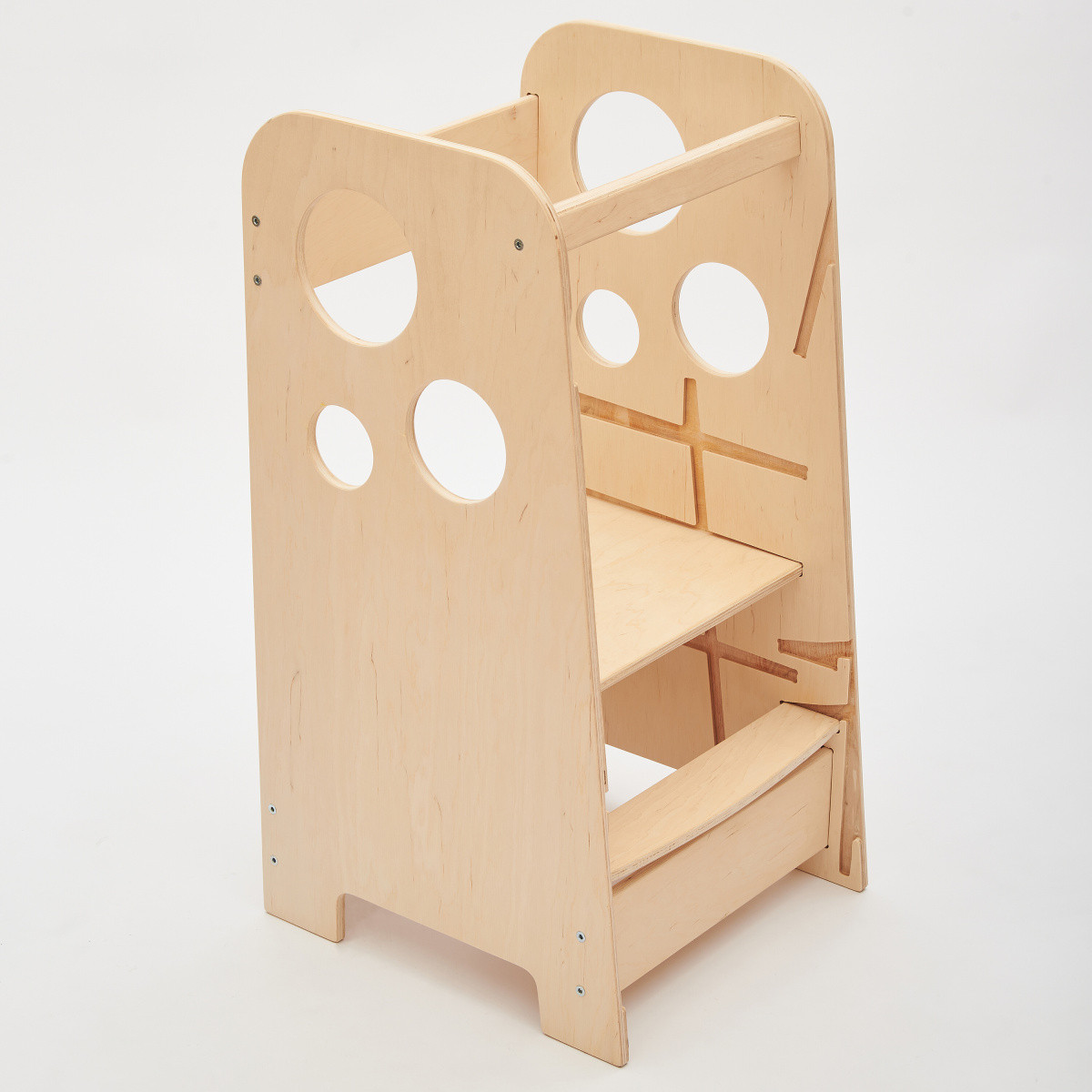 Věž je vyrobena z 12 mm březové překližky se zaoblenými hranami a hladkým povrchem. Je pevná a unese až 90 kg, přitom ji starší dítě dokáže samo posunout. Povrch je ošetřen bezbarvým, vodou ředitelným lakem odolným proti poškrábání. Díky přírodnímu vzhledu se hodí do jakéhokoli interiéru.