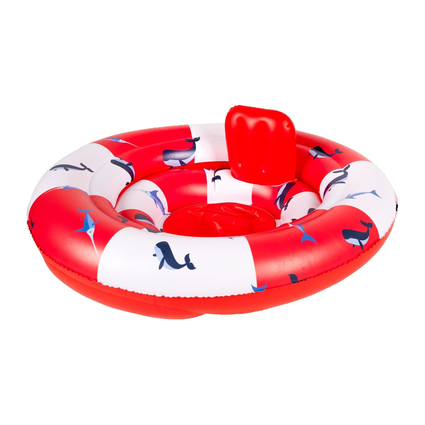 Základem je promyšlená konstrukce se čtyřmi samostatnými nafukovacími komorami, které pomáhají udržet stabilní tvar a zvyšují bezpečnost při používání. Miminko sedí v pevném sedátku uvnitř kruhu, doplněném o malou opěrku zad, díky které je poloha ještě pohodlnější a přirozenější.