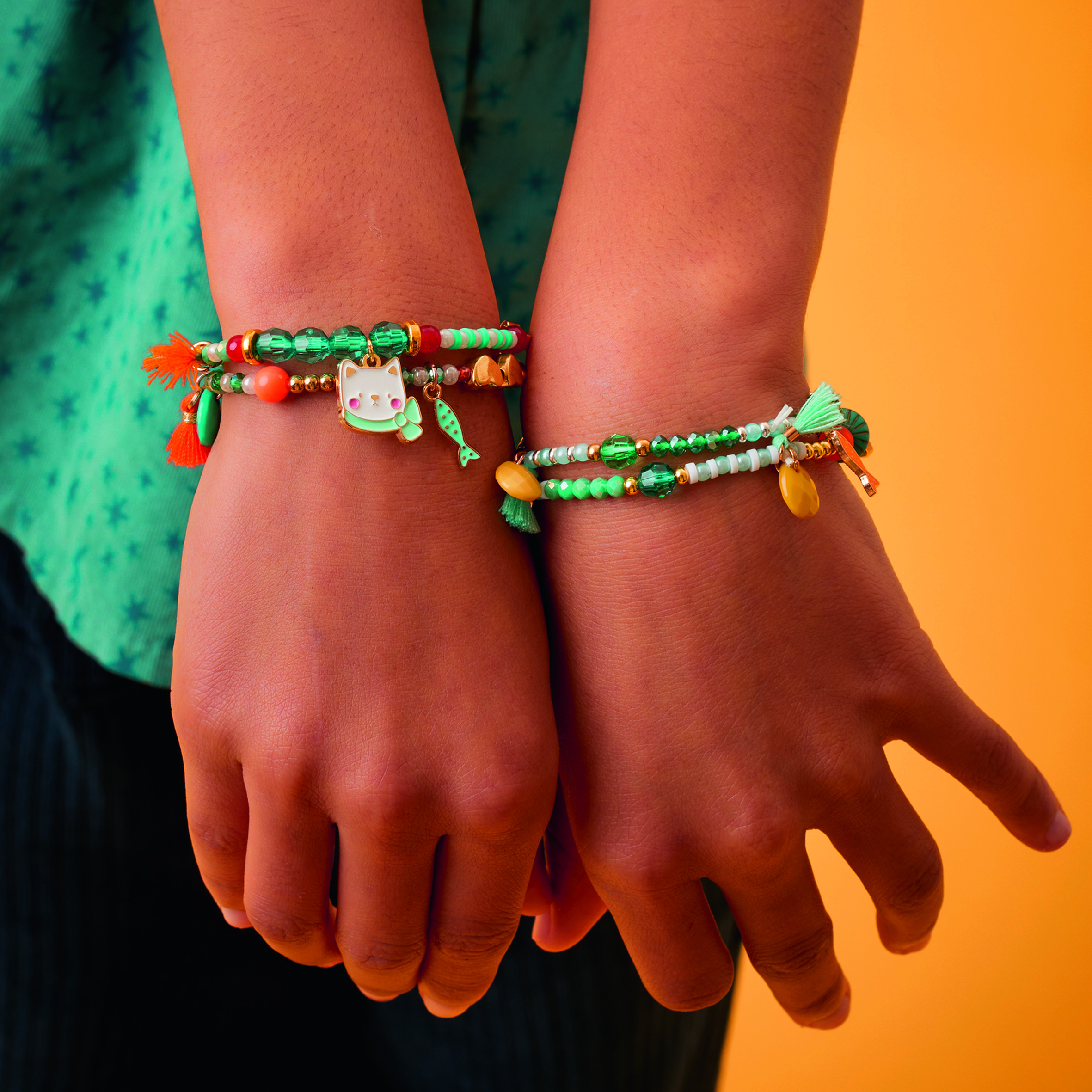 Náramek Hanaé s motivem kočičky dodá každému dětskému outfitu roztomilý a hravý nádech. Zdobí ho dva smaltované kovové přívěsky kočka a rybka a střapec. Akrylové korálky jsou navlečeny na dvojité elastické niti, která zajišťuje snadné nasazení a pohodlné nošení.