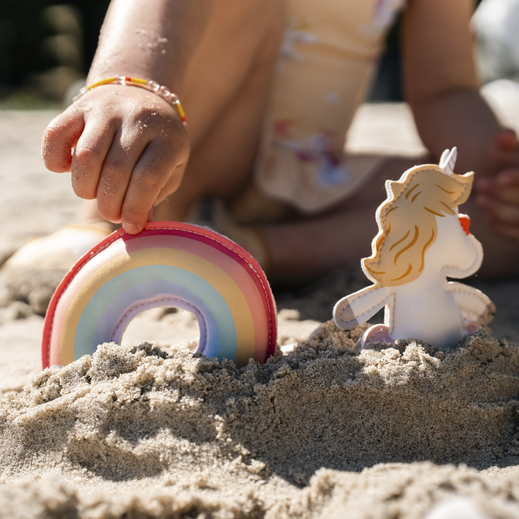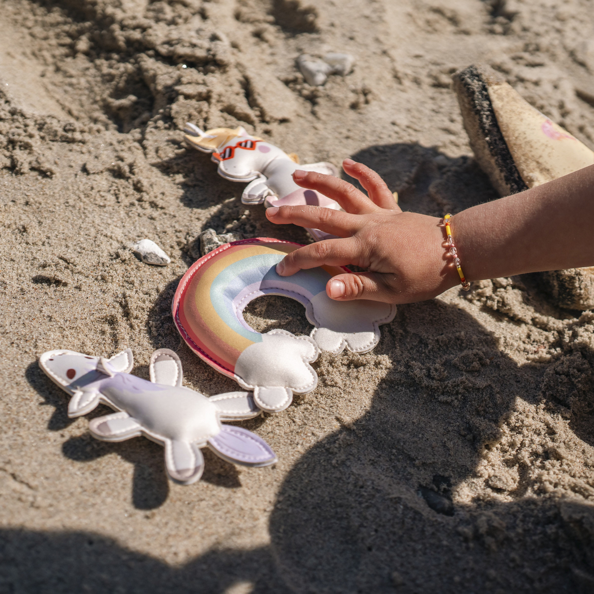 V tomto kouzelném setu se setkáte se dvěma půvabnými jednorožci a barevnou duhou – připravenými potápět se, plavat a točit se ve vodě. Každá figurka se ve vodě pohybuje jinak: některé klesají, jiné plavou – ale všechny podněcují zvědavost a zvou ke hře a objevování. Díky jemným pastelovým barvám a hravým tvarům přemění figurky každé koupání ve snový svět plný fantazie a pohybu.