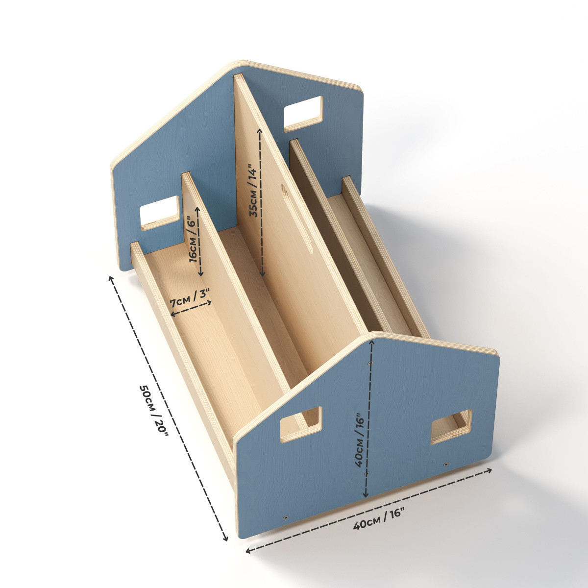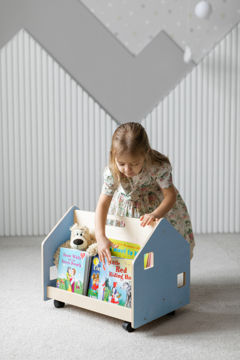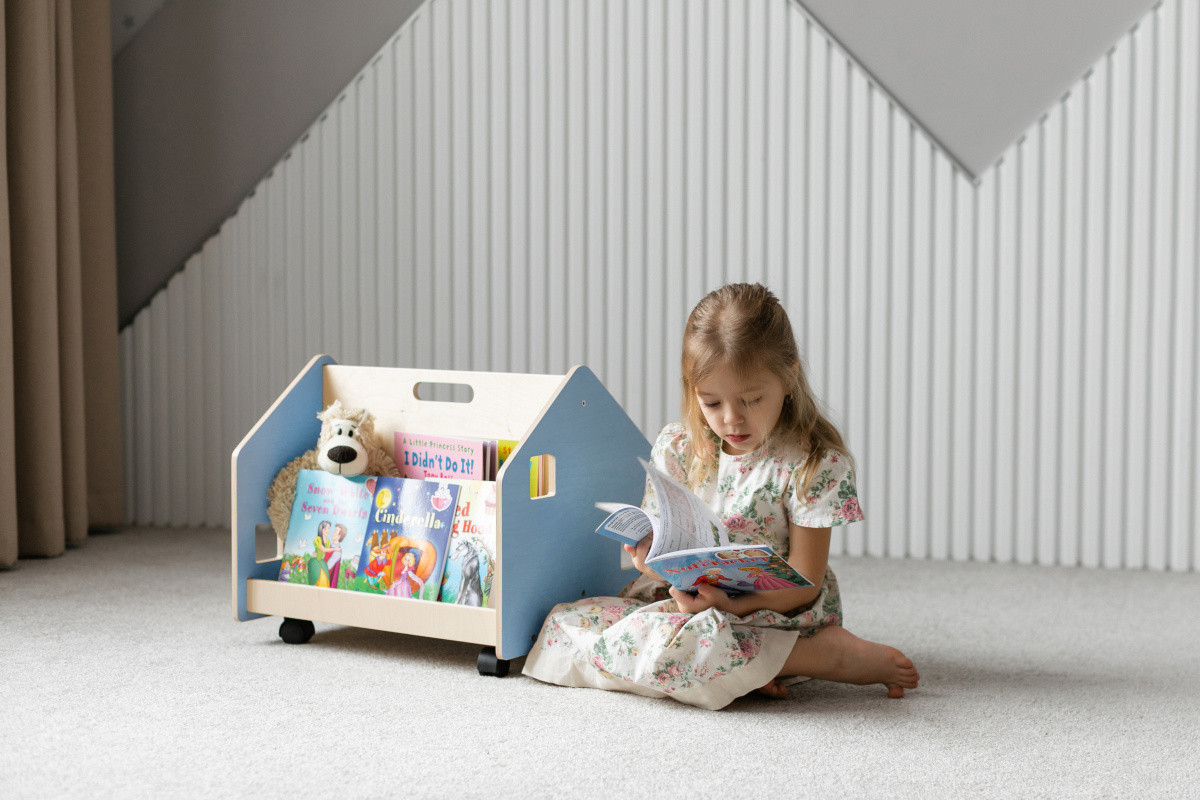 Oboustranná knihovna je praktické a bezpečné řešení pro dětský pokoj. Knihy jsou uloženy tak, aby děti viděly obálky a mohly si samy vybrat, co chtějí číst, což podporuje samostatnost a lásku ke čtení. Díky kolečkům knihovnu snadno přesunete kamkoli. Design je bezpečný, ekologický a přívětivý pro děti.