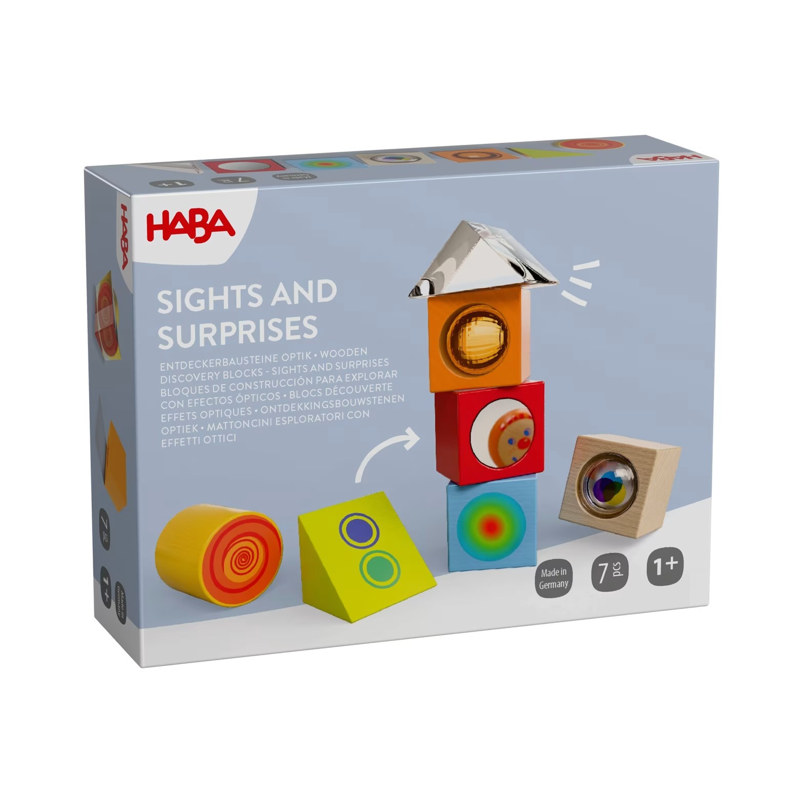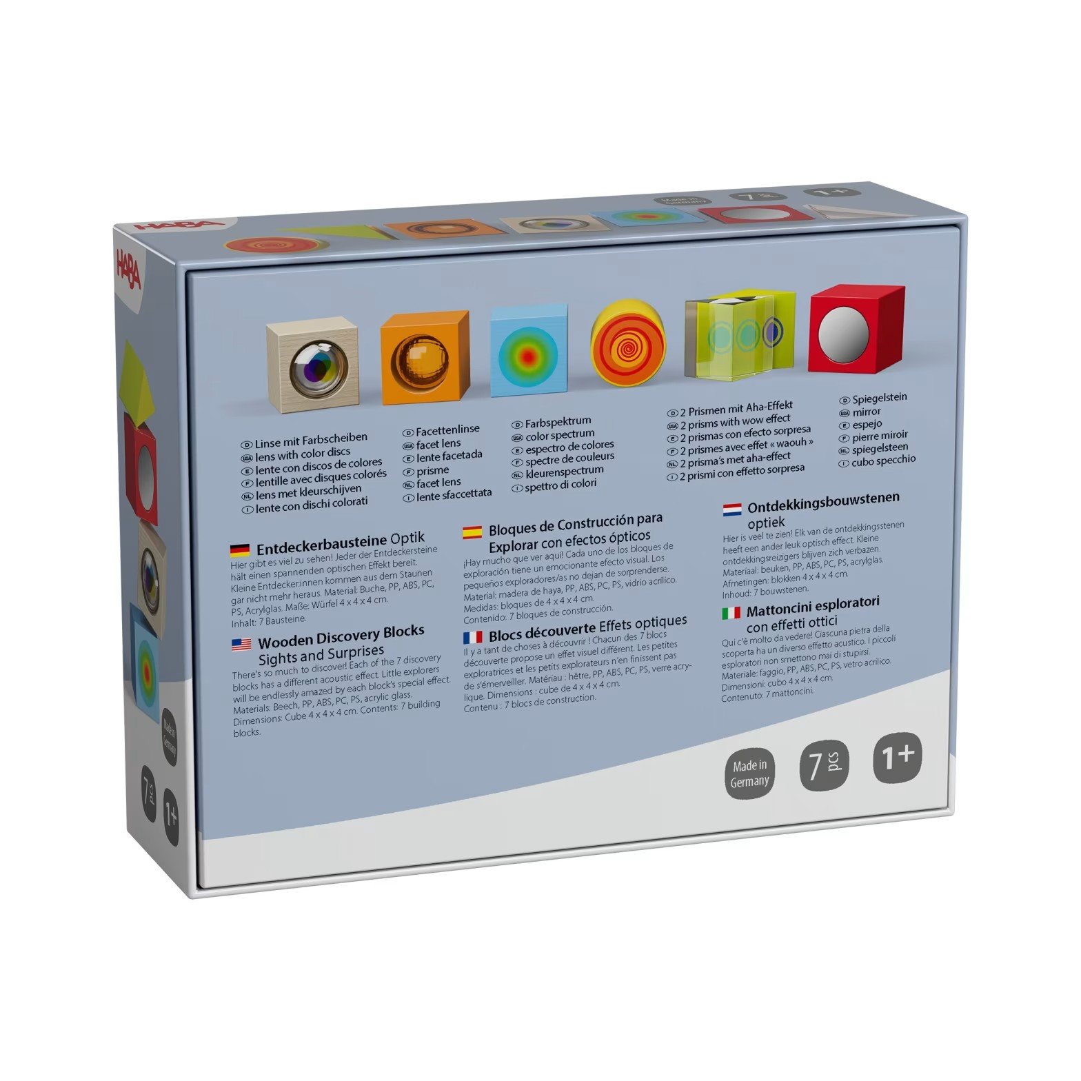 Každá kostka obsahuje optické prvky, které děti okouzlí a podnítí jejich zvědavost. S těmito kostkami si děti nejen hrají, ale také objevují schopnost vnímat prostor a barvy. Kostky jsou ideální pro rozvoj jemné motoriky a koordinace oko-ruka.