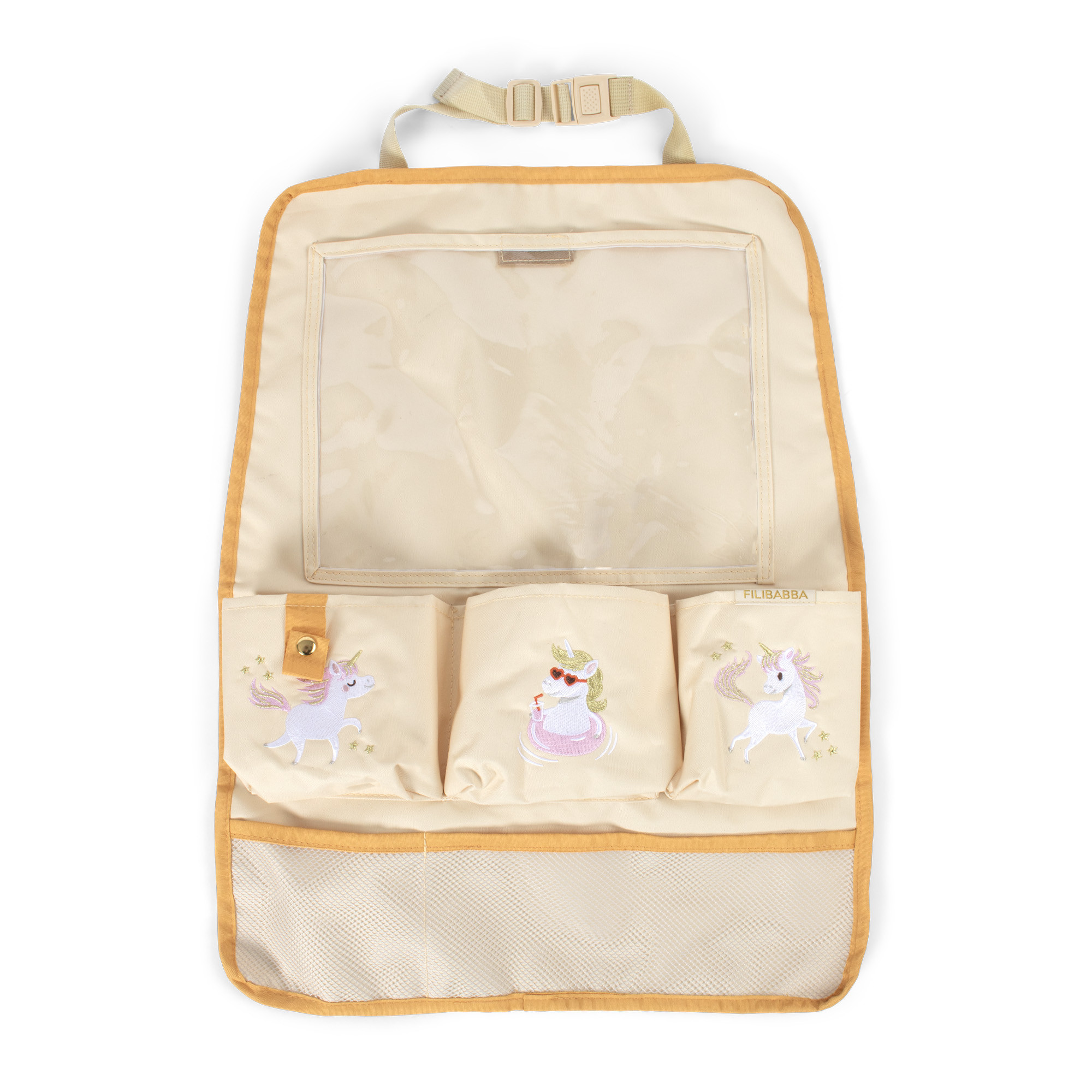 Jemné vyšívané detaily dodávají kouzlo, díky čemuž je nejen funkční, ale i stylový. Tento organizér je vyroben z odolné polyesterové tkaniny v recyklované kvalitě. Podívejte se na tento kouzelný potisk, dva roztomilí jednorožci se vznáší ve třpytu hvězd a další si užívá pohodu v kruhu ve vodě. Na světle žlutém pozadí zve tento rozmarný svět malé ratolesti do snového léta plného úžasu a něžné radosti.